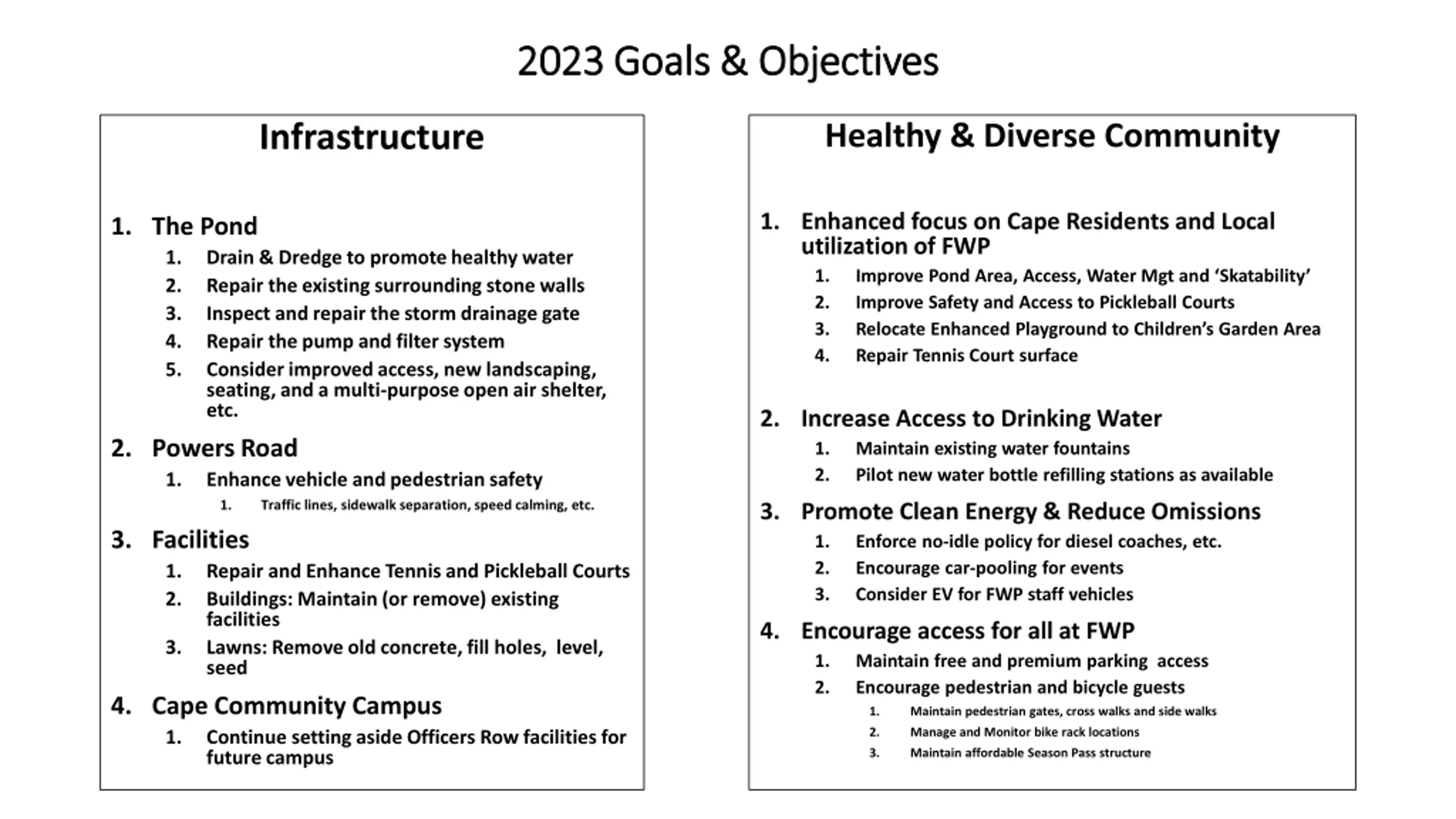 2023 Goals & Objectives 2023 Goals & Objectives Infrastructure Healthy & Diverse Community 1. Enhanced focus on Cape Residents and Local utilization of FWP 1. Improve Pond Area, Access, Water Mgt and Skatability 2. Improve Safety and Access to Pickleball Courts 3. Relocate Enhanced Playground to Children s Garden Area 4. Repair Tennis Court surface 1. The Pond 1. 2. 3. 4. 5. Drain & Dredge to promote healthy water Repair the existing surrounding stone walls Inspect and repair the storm drainage gate Repair the pump and filter system Consider improved access, new landscaping, seating, and a multi-purpose open air shelter, etc. 2. Increase Access to Drinking Water 1. Maintain existing water fountains 2. Pilot new water bottle refilling stations as available 2. Powers Road 1. Enhance vehicle and pedestrian safety 1. Traffic lines, sidewalk separation, speed calming, etc. 3. Promote Clean Energy & Reduce Omissions 1. Enforce no-idle policy for diesel coaches, etc. 2. Encourage car-pooling for events 3. Consider EV for FWP staff vehicles 3. Facilities 1. 2. Repair and Enhance Tennis and Pickleball Courts Buildings: Maintain (or remove) existing facilities Lawns: Remove old concrete, fill holes, level, seed 4. Encourage access for all at FWP 1. Maintain free and premium parking access 2. Encourage pedestrian and bicycle guests 3. 4. Cape Community Campus 1. Continue setting aside Officers Row facilities for future campus 1. Maintain pedestrian gates, cross walks and side walks 2. Manage and Monitor bike rack locations 3. Maintain affordable Season Pass structure
