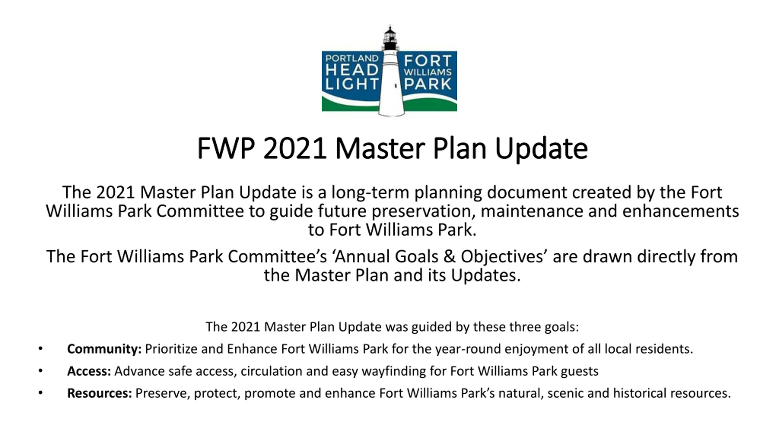 FWP 2021 Master Plan Update FWP 2021 Master Plan Update The 2021 Master Plan Update is a long-term planning document created by the Fort Williams Park Committee to guide future preservation, maintenance and enhancements to Fort Williams Park. The Fort Williams Park Committee s Annual Goals & Objectives are drawn directly from the Master Plan and its Updates. The 2021 Master Plan Update was guided by these three goals: Community: Prioritize and Enhance Fort Williams Park for the year-round enjoyment of all local residents. Access: Advance safe access, circulation and easy wayfinding for Fort Williams Park guests Resources: Preserve, protect, promote and enhance Fort Williams Park s natural, scenic and historical resources.