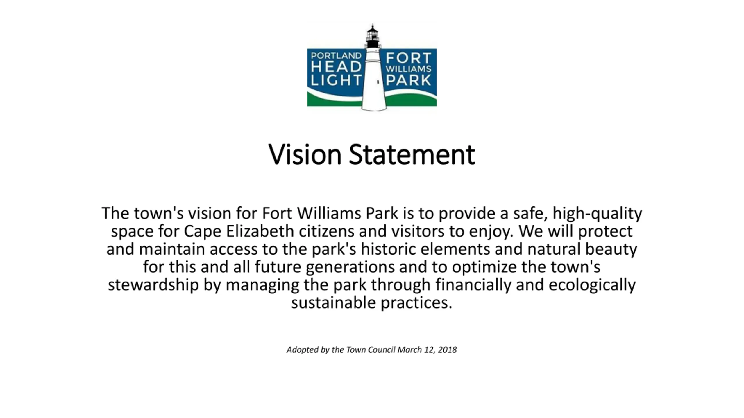 Vision Statement Vision Statement The town's vision for Fort Williams Park is to provide a safe, high-quality space for Cape Elizabeth citizens and visitors to enjoy. We will protect and maintain access to the park's historic elements and natural beauty for this and all future generations and to optimize the town's stewardship by managing the park through financially and ecologically sustainable practices. Adopted by the Town Council March 12, 2018