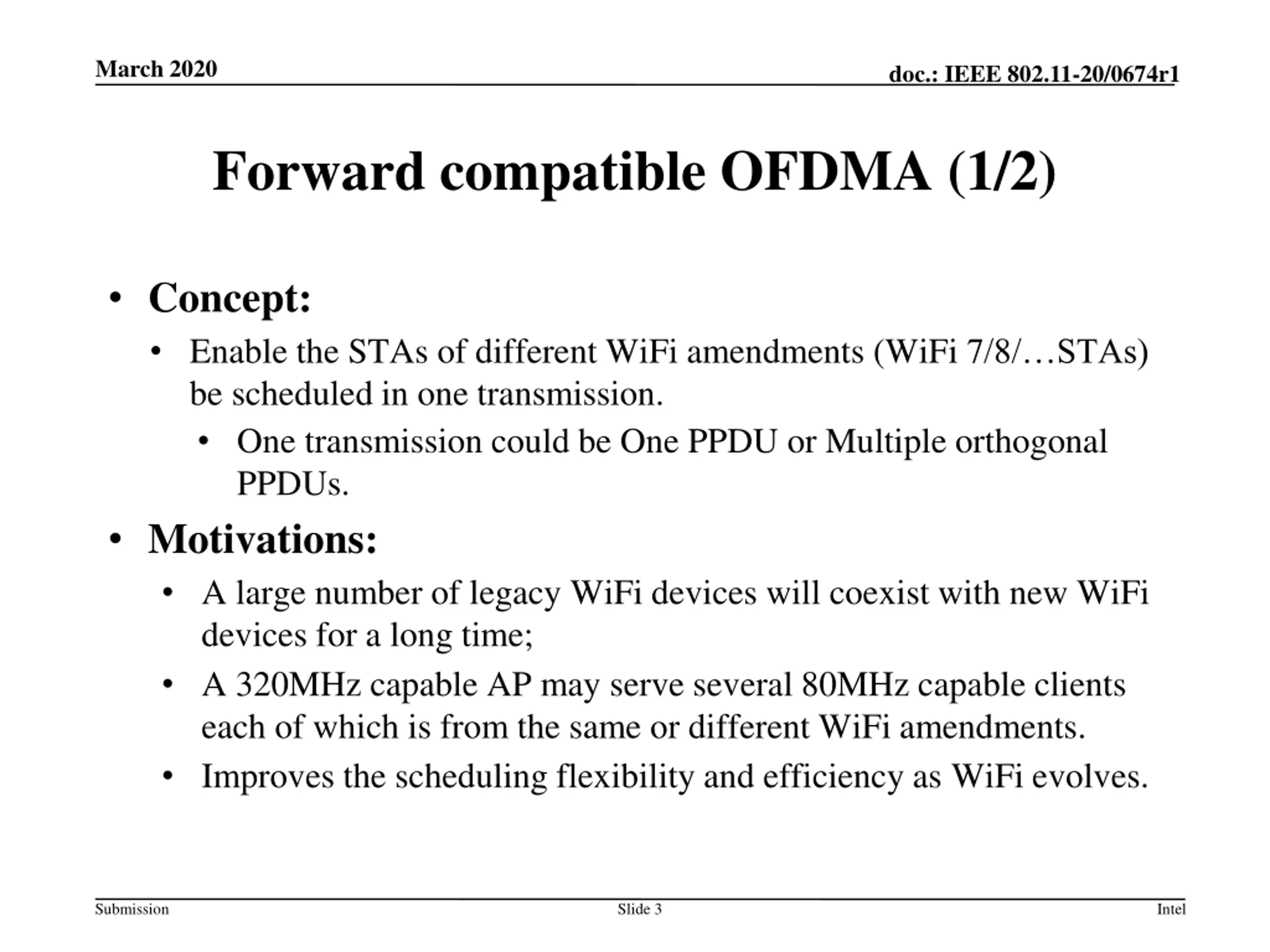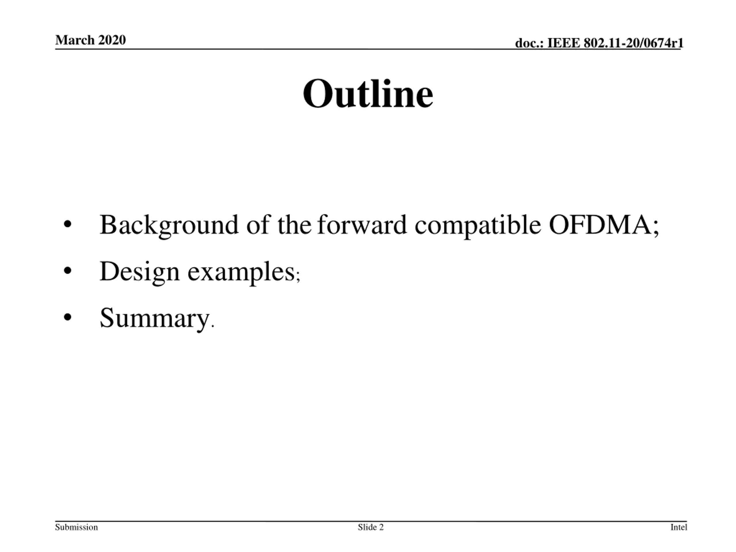 March 2020 doc.: IEEE 802.11-20/0674r1 Outline Background of theforward compatible OFDMA; Design examples; Summary. Submission Slide 2 Intel