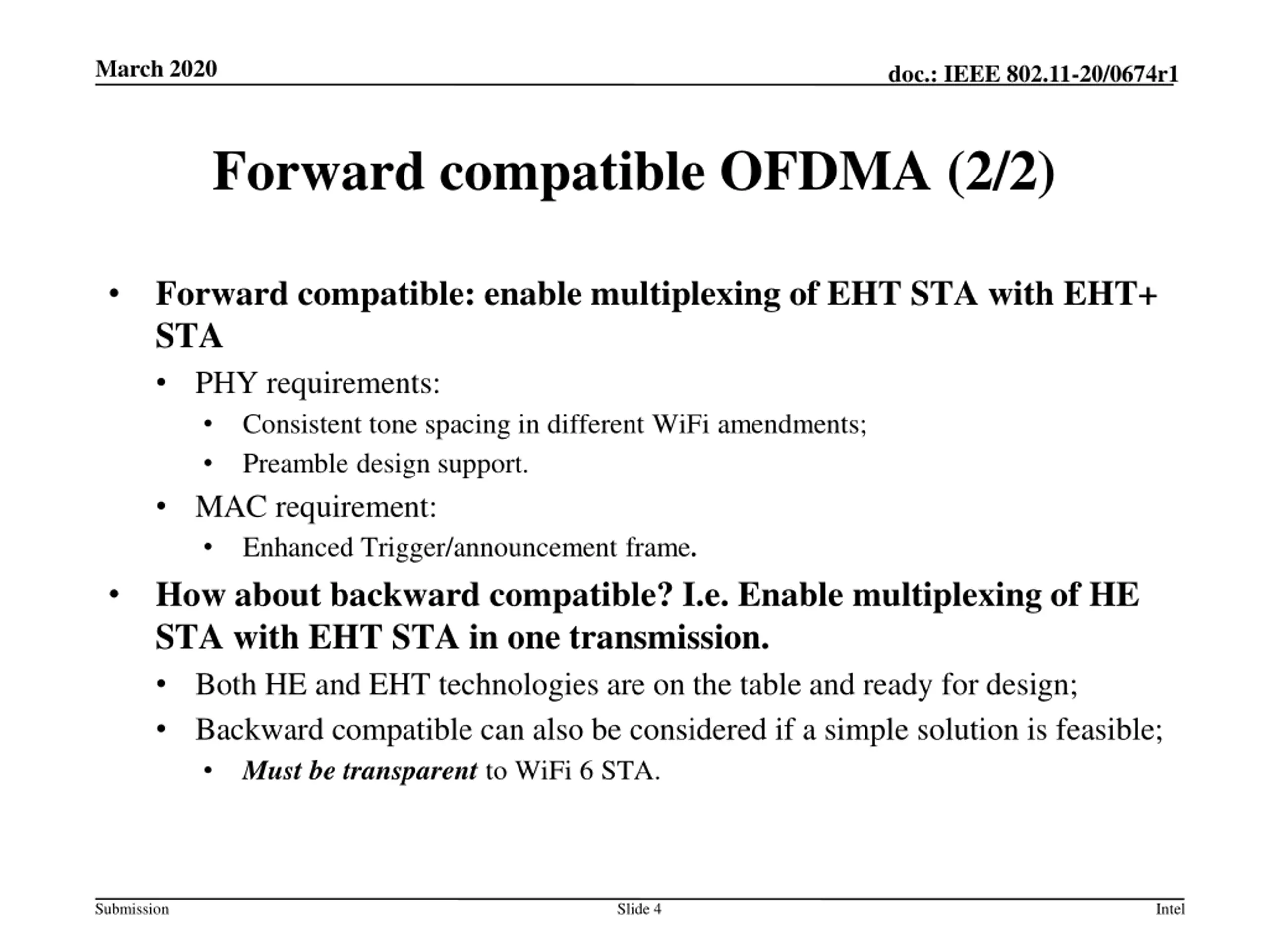 March 2020 doc.: IEEE 802.11-20/0674r1 Forward compatible OFDMA (1/2) Concept: Enable the STAs of different WiFi amendments (WiFi 7/8/ STAs) be scheduled in one transmission. One transmission could be One PPDU or Multiple orthogonal PPDUs. Motivations: A large number of legacy WiFi devices will coexist with new WiFi devices for a long time; A 320MHz capable AP may serve several 80MHz capable clients each of which is from the same or different WiFi amendments. Improves the scheduling flexibility and efficiency as WiFi evolves. Submission Slide 3 Intel