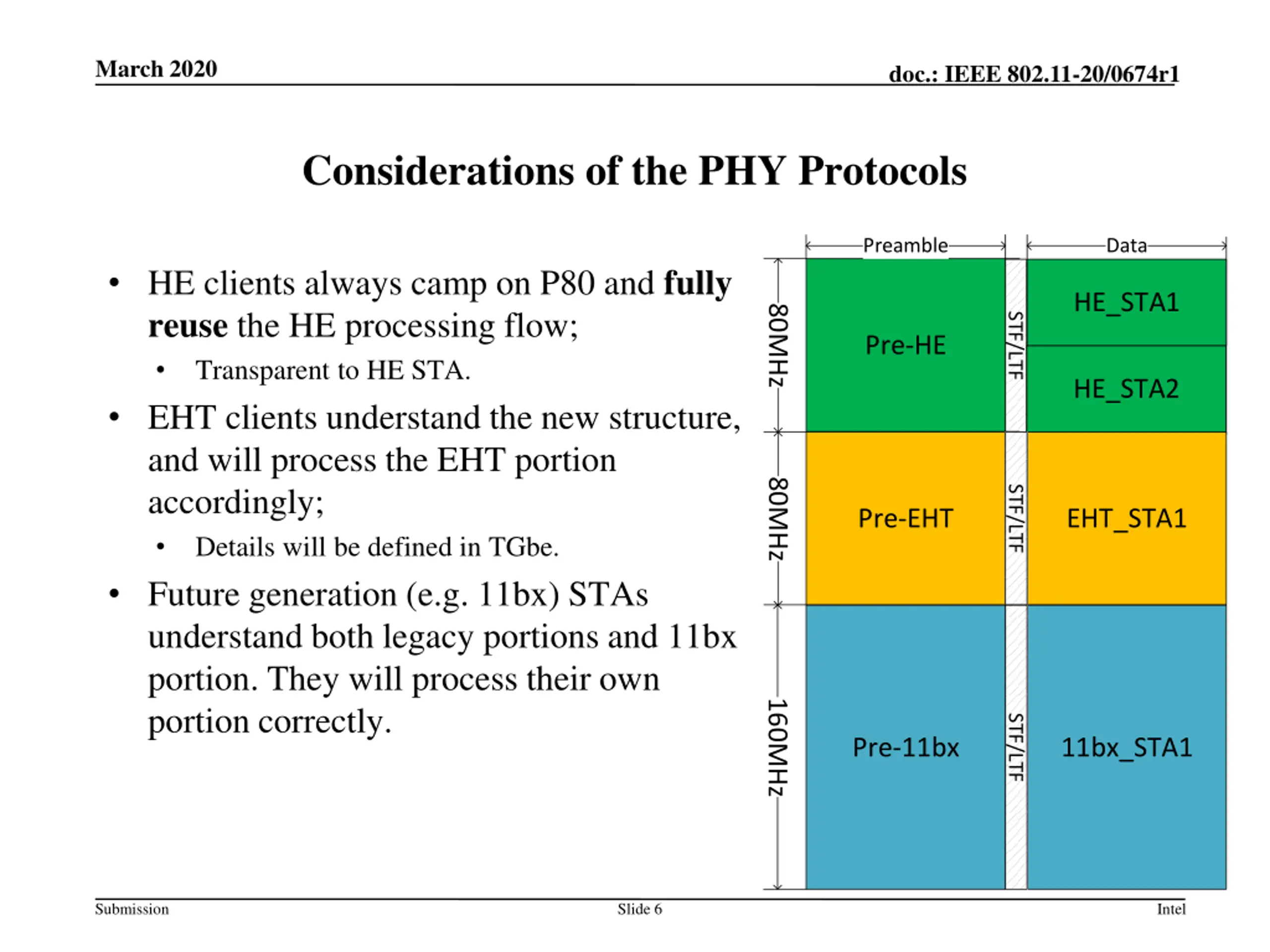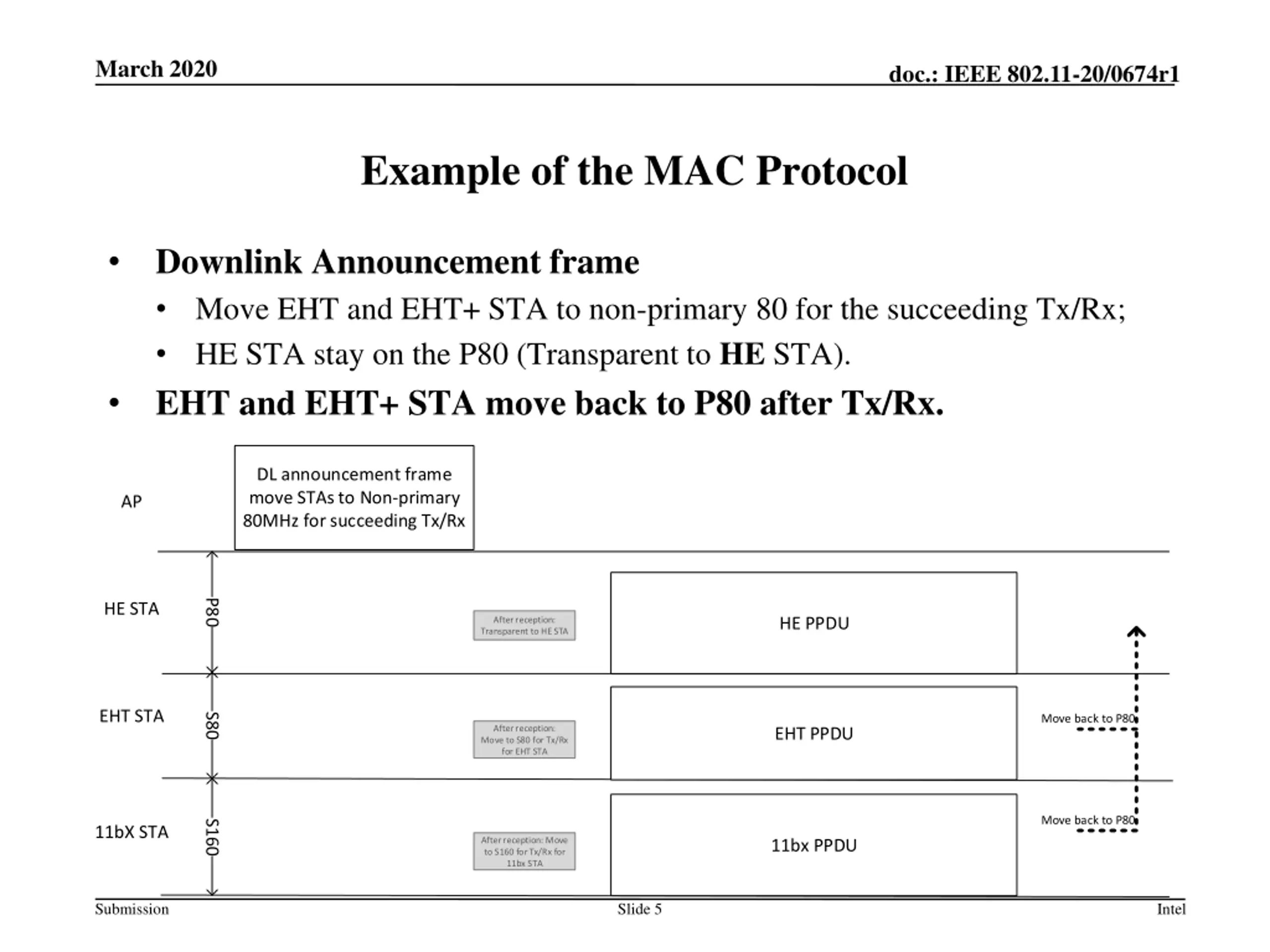 March 2020 doc.: IEEE 802.11-20/0674r1 Example of the MAC Protocol Downlink Announcement frame Move EHT and EHT+ STA to non-primary 80 for the succeeding Tx/Rx; HE STA stay on the P80 (Transparent to HE STA). EHT and EHT+ STA move back to P80 after Tx/Rx. DL announcement frame move STAs to Non-primary 80MHz for succeeding Tx/Rx AP P80 HE STA HE PPDU After reception: Transparent to HE STA EHT STA S80 Move back to P80 After reception: Move to S80 for Tx/Rx for EHT STA EHT PPDU Move back to P80 S160 11bX STA After reception: Move to S160 for Tx/Rx for 11bx STA 11bx PPDU Submission Slide 5 Intel