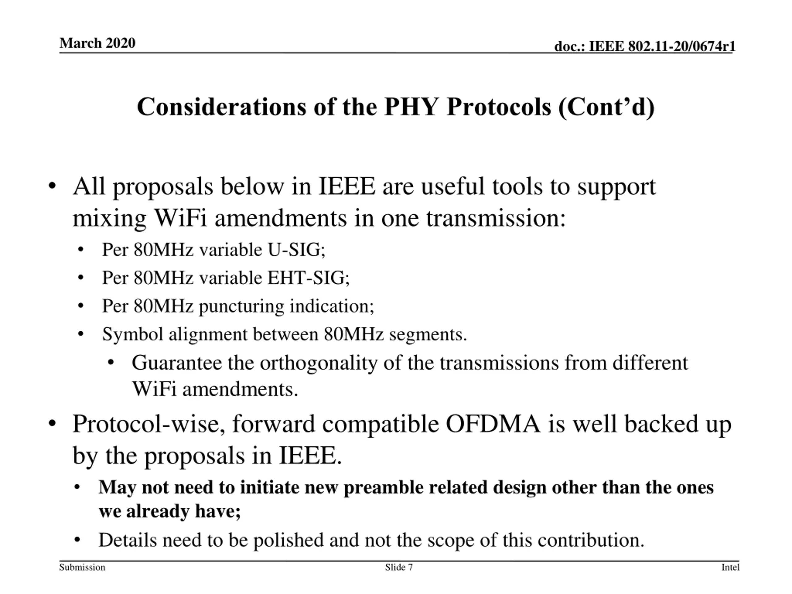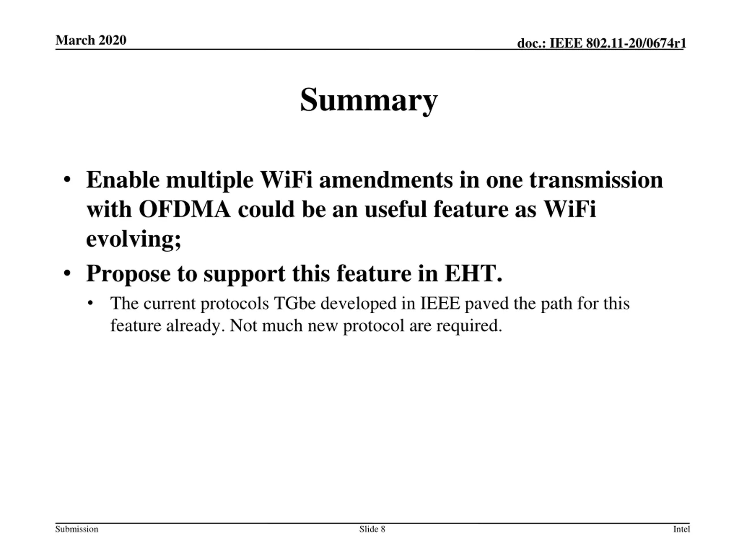 March 2020 doc.: IEEE 802.11-20/0674r1 Considerations of the PHY Protocols (Cont d) All proposals below in IEEE are useful tools to support mixing WiFi amendments in one transmission: Per 80MHz variable U-SIG; Per 80MHz variable EHT-SIG; Per 80MHz puncturing indication; Symbol alignment between 80MHz segments. Guarantee the orthogonality of the transmissions from different WiFi amendments. Protocol-wise, forward compatible OFDMA is well backed up by the proposals in IEEE. May not need to initiate new preamble related design other than the ones we already have; Details need to be polished and not the scope of this contribution. Submission Slide 7 Intel