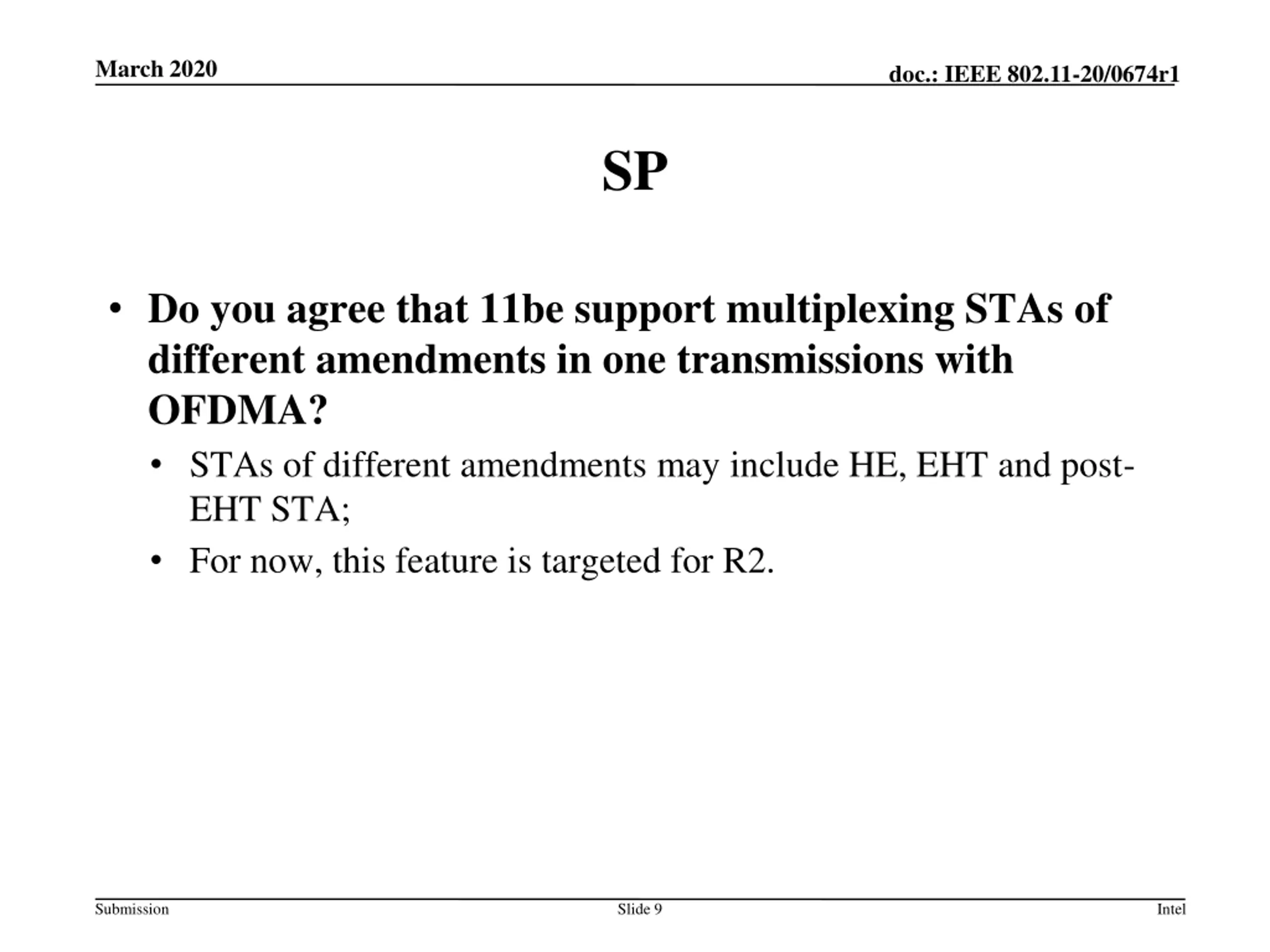 March 2020 doc.: IEEE 802.11-20/0674r1 SP Do you agree that 11be support multiplexing STAs of different amendments in one transmissions with OFDMA? STAs of different amendments may include HE, EHT and post- EHT STA; For now, this feature is targeted for R2. Submission Slide 9 Intel