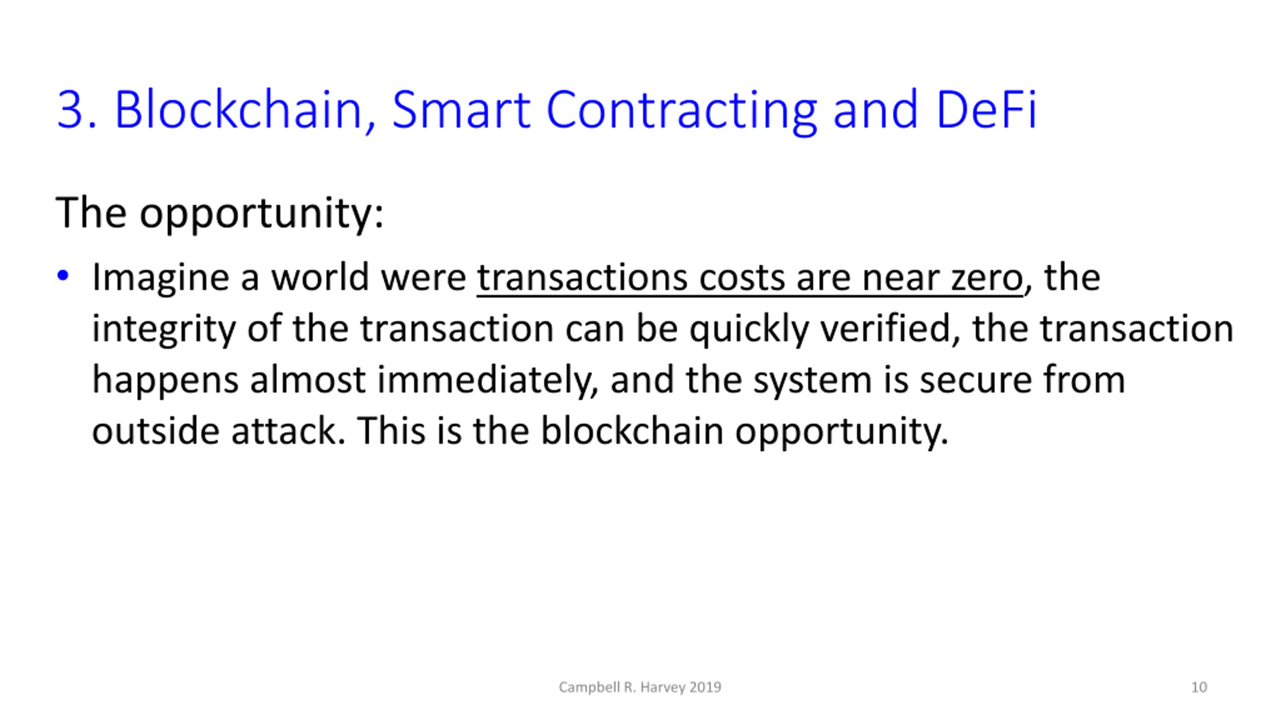 3. Blockchain, Smart Contracting and DeFi The opportunity: Imagine a world were transactions costs are near zero, the integrity of the transaction can be quickly verified, the transaction happens almost immediately, and the system is secure from outside attack. This is the blockchain opportunity. Campbell R. Harvey 2019 10