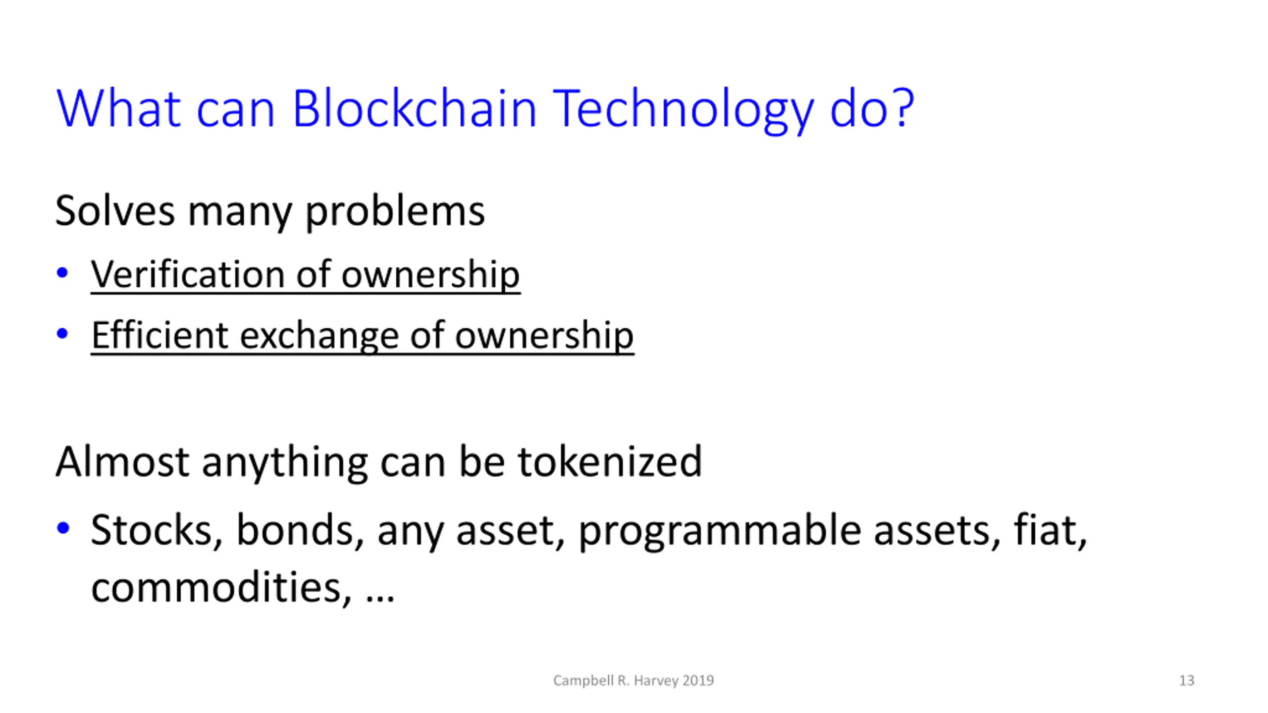 What can Blockchain Technology do? Solves many problems Verification of ownership Efficient exchange of ownership Almost anything can be tokenized Stocks, bonds, any asset, programmable assets, fiat, commodities, Campbell R. Harvey 2019 13