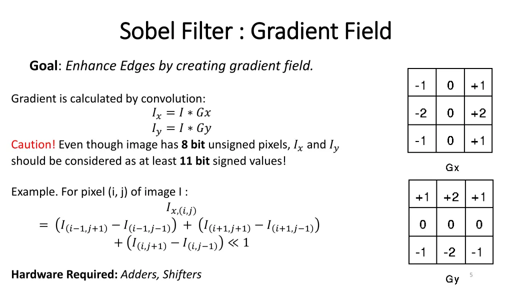 Sobel Sobel Filter : Gradient Field Filter : Gradient Field Goal: Enhance Edges by creating gradient field. Gradient is calculated by convolution: ??= ? ?? ??= ? ?? Caution! Even though image has 8 bit unsigned pixels, ?? and ?? should be considered as at least 11 bit signed values! Example. For pixel (i, j) of image I : ??, ?,? + ??+1,?+1 ??+1,? 1 + ??,?+1 ??,? 1 = ?? 1,?+1 ?? 1,? 1 1 Hardware Required:Adders, Shifters 5