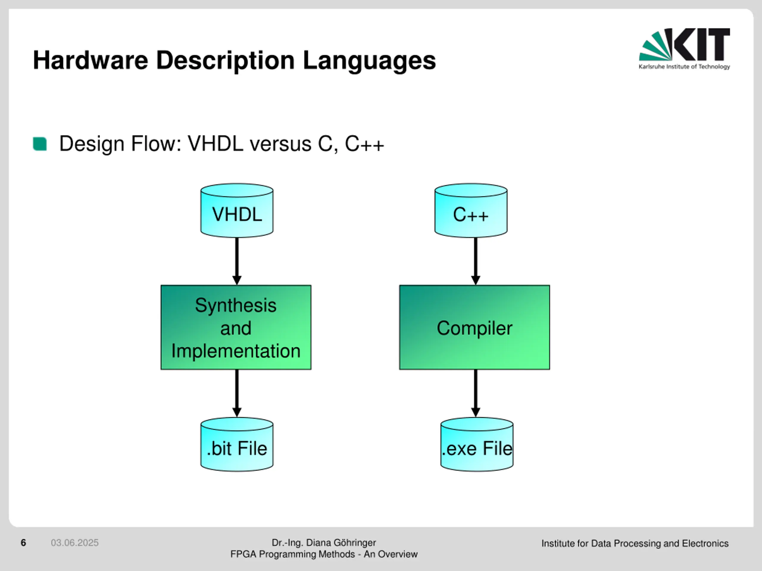 Hardware Description Languages Design Flow: VHDL versus C, C++ VHDL C++ Synthesis and Implementation Compiler .bit File .exe File 03.06.2025 Dr.-Ing. Diana G hringer FPGA Programming Methods - An Overview 6 Institute for Data Processing and Electronics