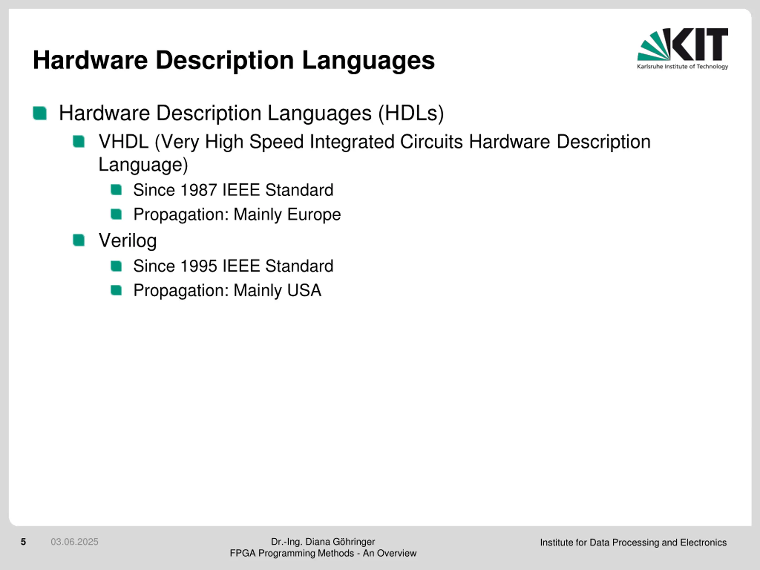 Hardware Description Languages Hardware Description Languages (HDLs) VHDL (Very High Speed Integrated Circuits Hardware Description Language) Since 1987 IEEE Standard Propagation: Mainly Europe Verilog Since 1995 IEEE Standard Propagation: Mainly USA 03.06.2025 Dr.-Ing. Diana G hringer FPGA Programming Methods - An Overview 5 Institute for Data Processing and Electronics