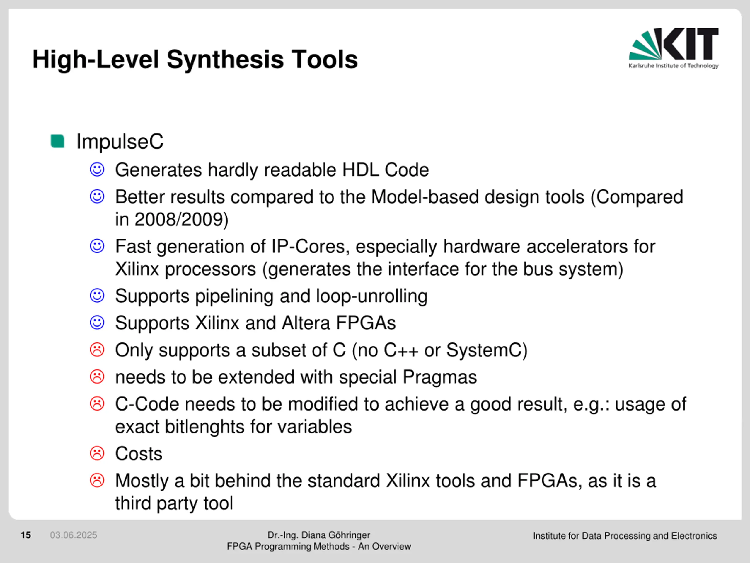 High-Level Synthesis Tools: Motivation HDL C, C++ Abstraction level Development time Error Correction 03.06.2025 Dr.-Ing. Diana G hringer FPGA Programming Methods - An Overview 12 Institute for Data Processing and Electronics
