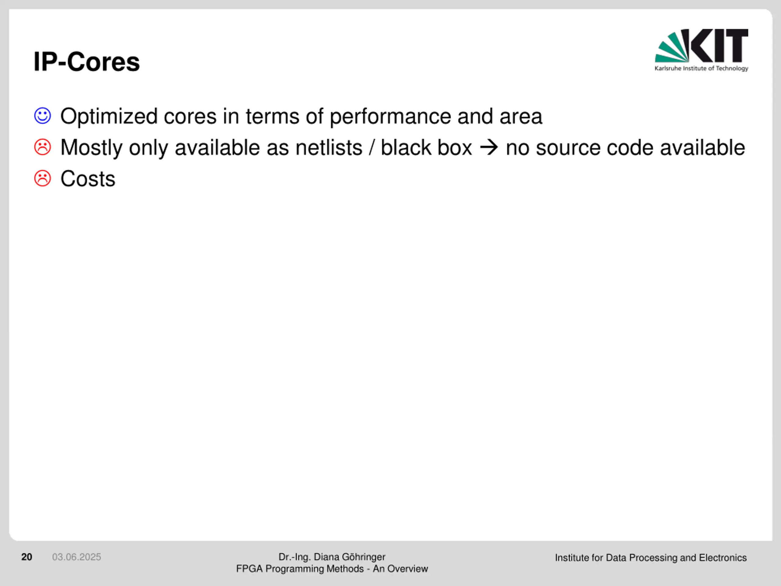 IP-Cores Optimized cores in terms of performance and area Mostly only available as netlists / black box no source code available Costs 03.06.2025 Dr.-Ing. Diana G hringer FPGA Programming Methods - An Overview 20 Institute for Data Processing and Electronics