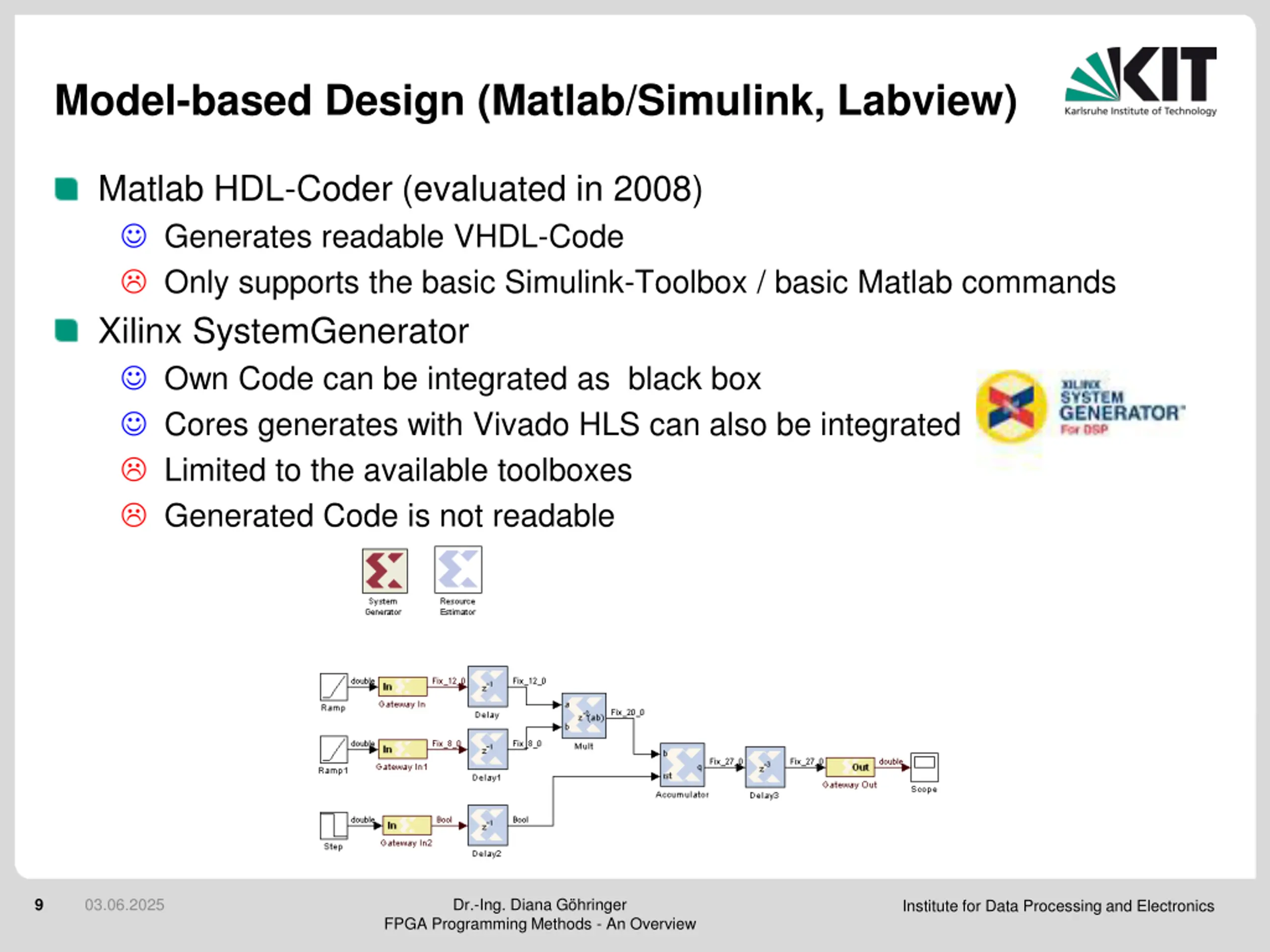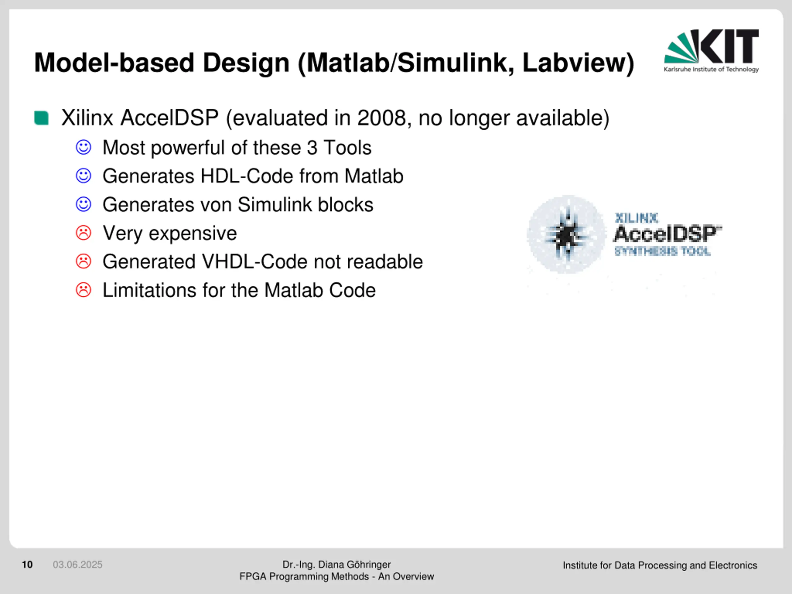 Model-based Design (Matlab/Simulink, Labview) Xilinx AccelDSP (evaluated in 2008, no longer available) Most powerful of these 3 Tools Generates HDL-Code from Matlab Generates von Simulink blocks Very expensive Generated VHDL-Code not readable Limitations for the Matlab Code 03.06.2025 Dr.-Ing. Diana G hringer FPGA Programming Methods - An Overview 10 Institute for Data Processing and Electronics