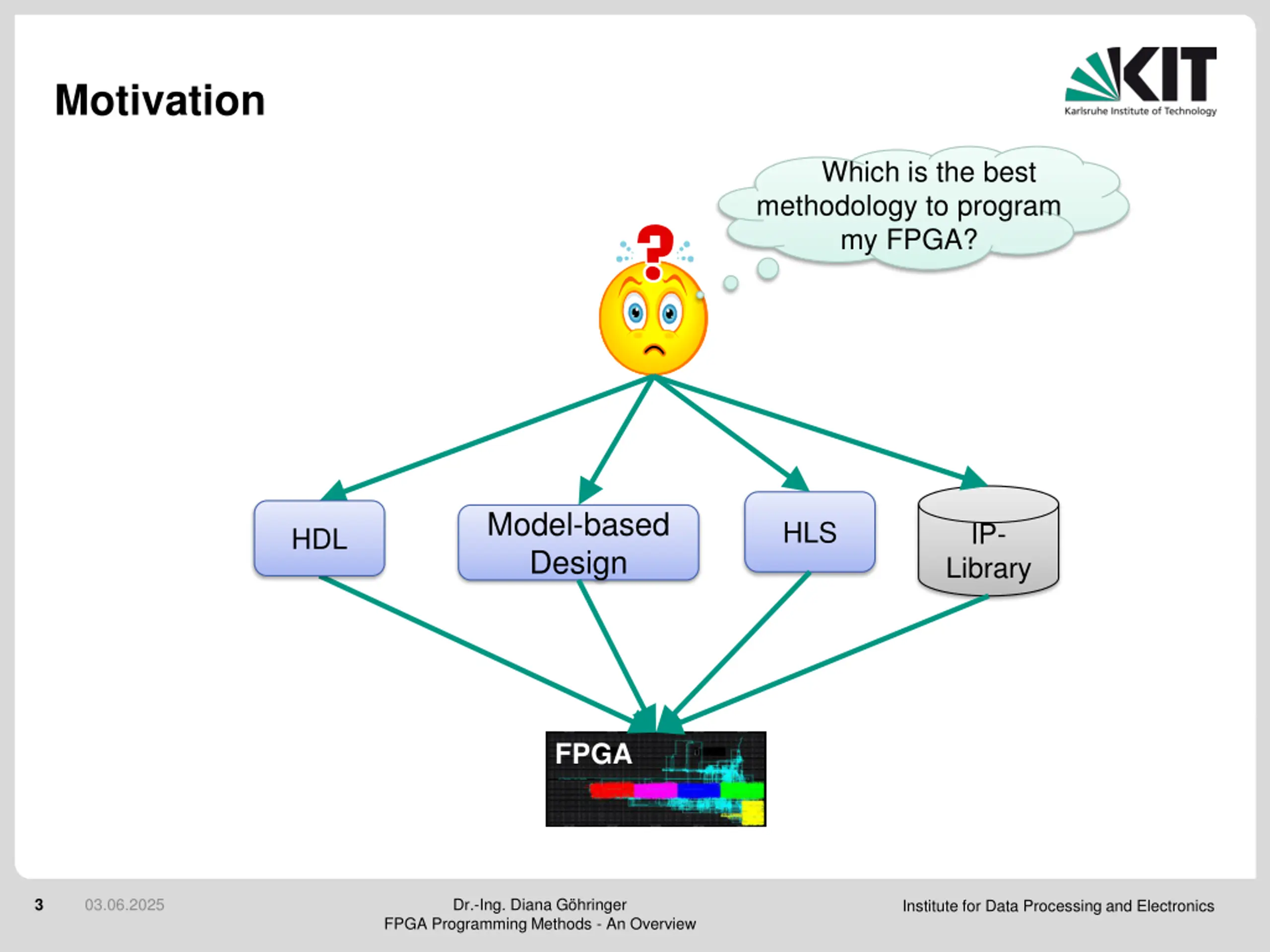 Motivation Which is the best methodology to program my FPGA? Model-based Design HLS IP- HDL Library FPGA 03.06.2025 Dr.-Ing. Diana G hringer FPGA Programming Methods - An Overview 3 Institute for Data Processing and Electronics