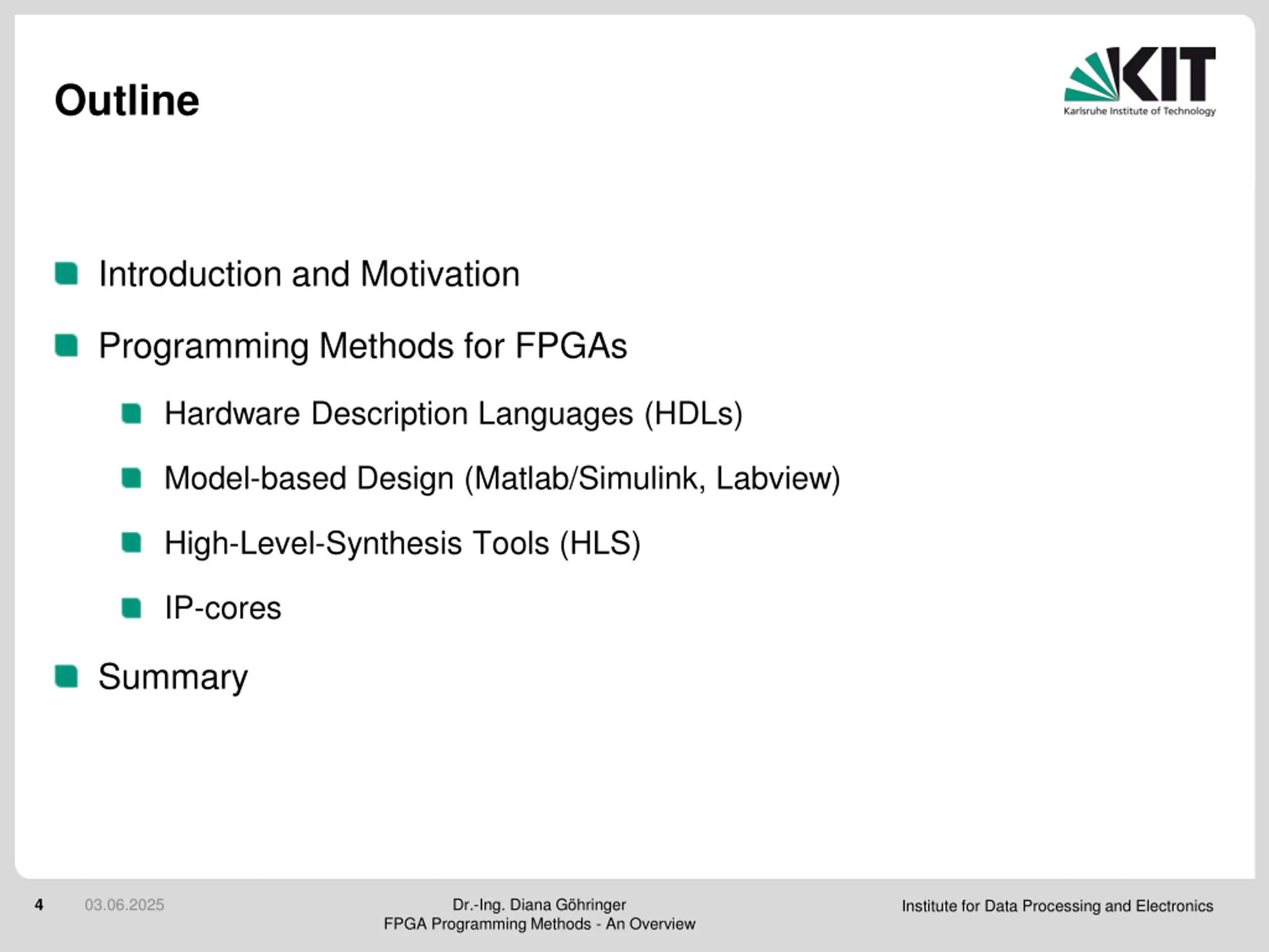Outline Introduction and Motivation Programming Methods for FPGAs Hardware Description Languages (HDLs) Model-based Design (Matlab / Simulink) High-Level-Synthesis Tools (HLS) IP-cores Summary 03.06.2025 Dr.-Ing. Diana G hringer FPGA Programming Methods - An Overview 2 Institute for Data Processing and Electronics