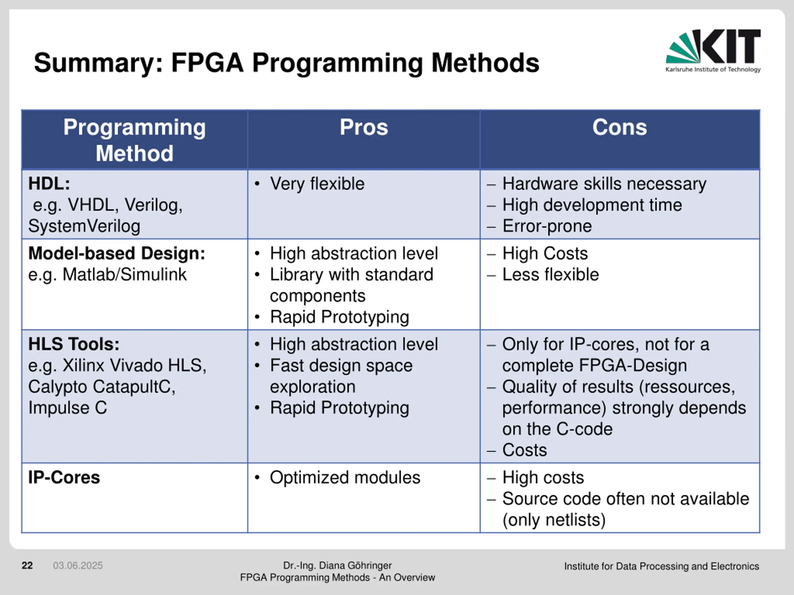 Outline Introduction and Motivation Programming Methods for FPGAs Hardware Description Languages (HDLs) Model-based Design (Matlab/Simulink, Labview) High-Level-Synthesis Tools (HLS) IP-cores Summary 03.06.2025 Dr.-Ing. Diana G hringer FPGA Programming Methods - An Overview 19 Institute for Data Processing and Electronics