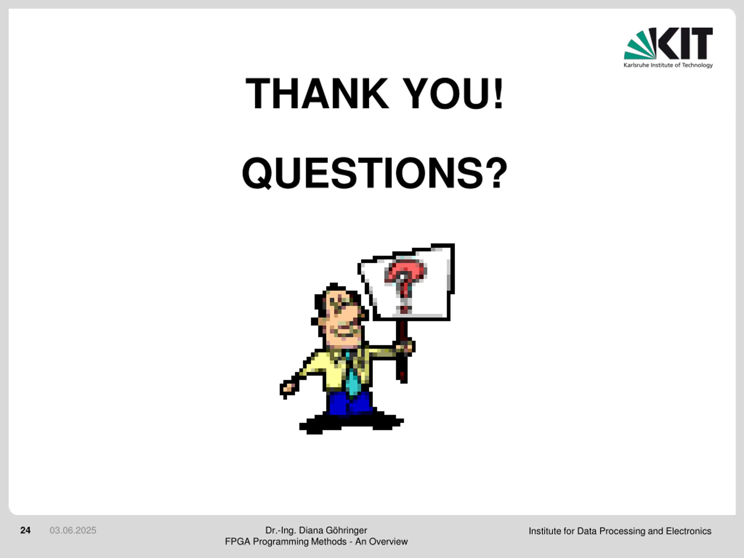 THANK YOU! QUESTIONS? 03.06.2025 Dr.-Ing. Diana G hringer FPGA Programming Methods - An Overview 24 Institute for Data Processing and Electronics