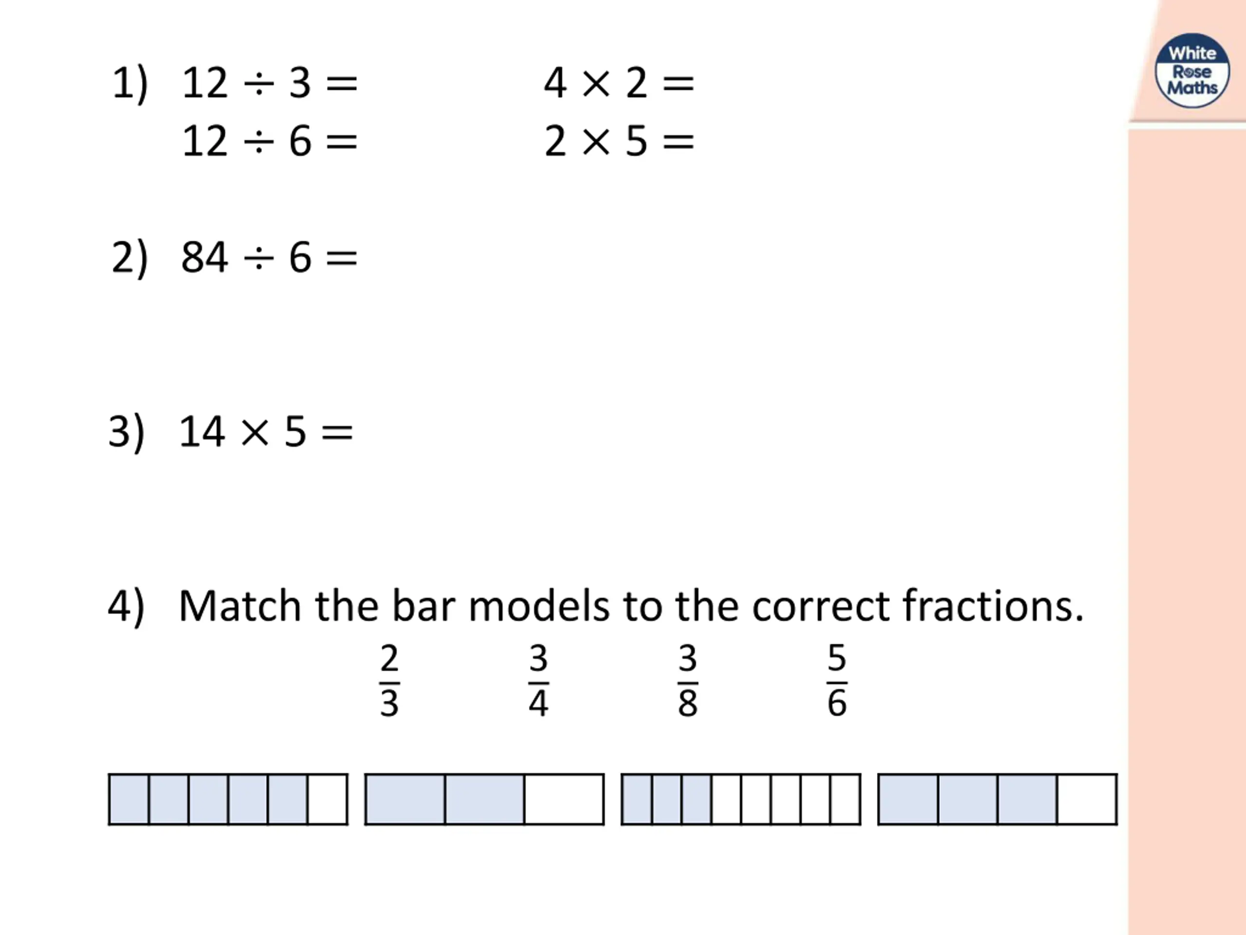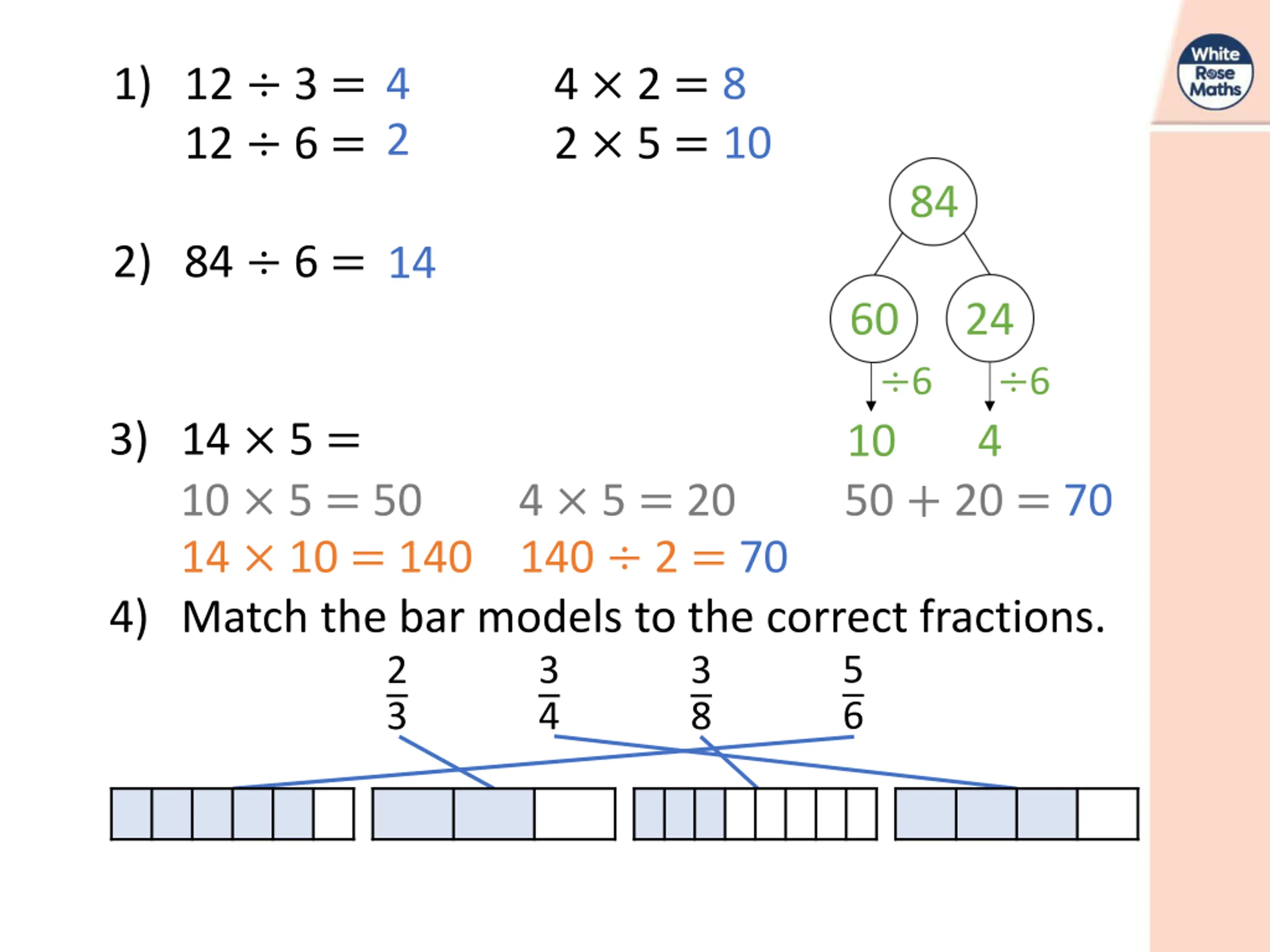1) 12 3 = 12 6 = 4 2 = 2 5 = 2) 84 6 = 3) 14 5 = 4) Match the bar models to the correct fractions. 2 3 5 6 3 4 3 8