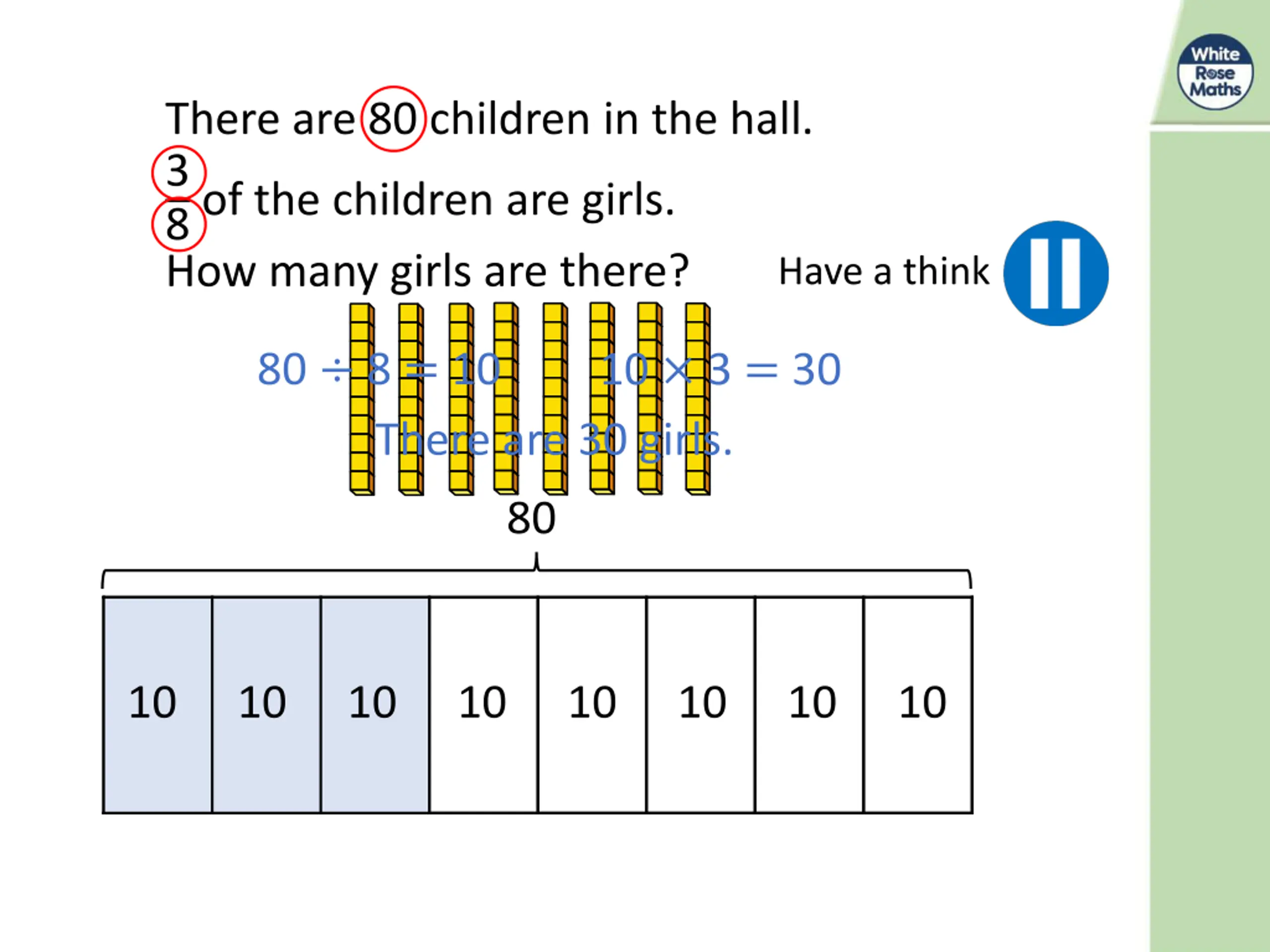 There are 80 children in the hall. 3 8 of the children are girls. How many girls are there? Have a think 80 8 = 10 10 3 = 30 There are 30 girls. 80 10 10 10 10 10 10 10 10