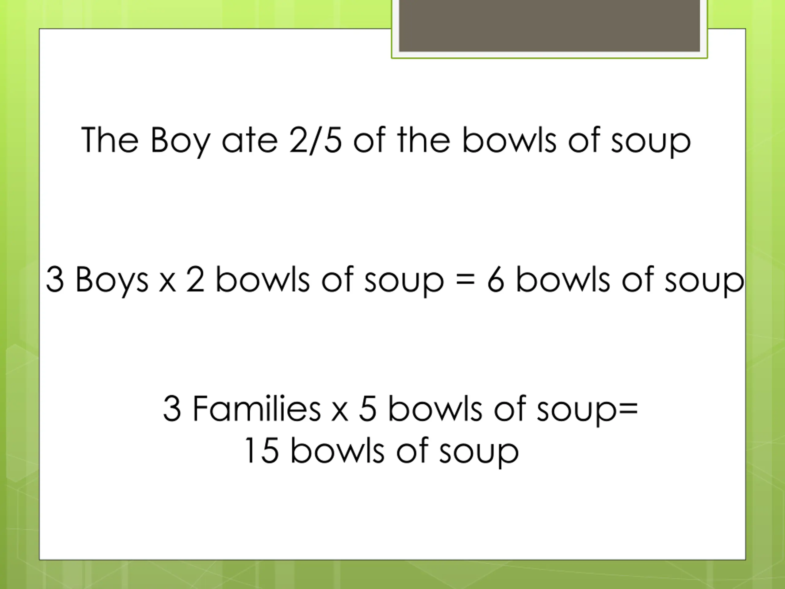 The Boy ate 2/5 of the bowls of soup 3 Boys x 2 bowls of soup = 6 bowls of soup 3 Families x 5 bowls of soup= 15 bowls of soup