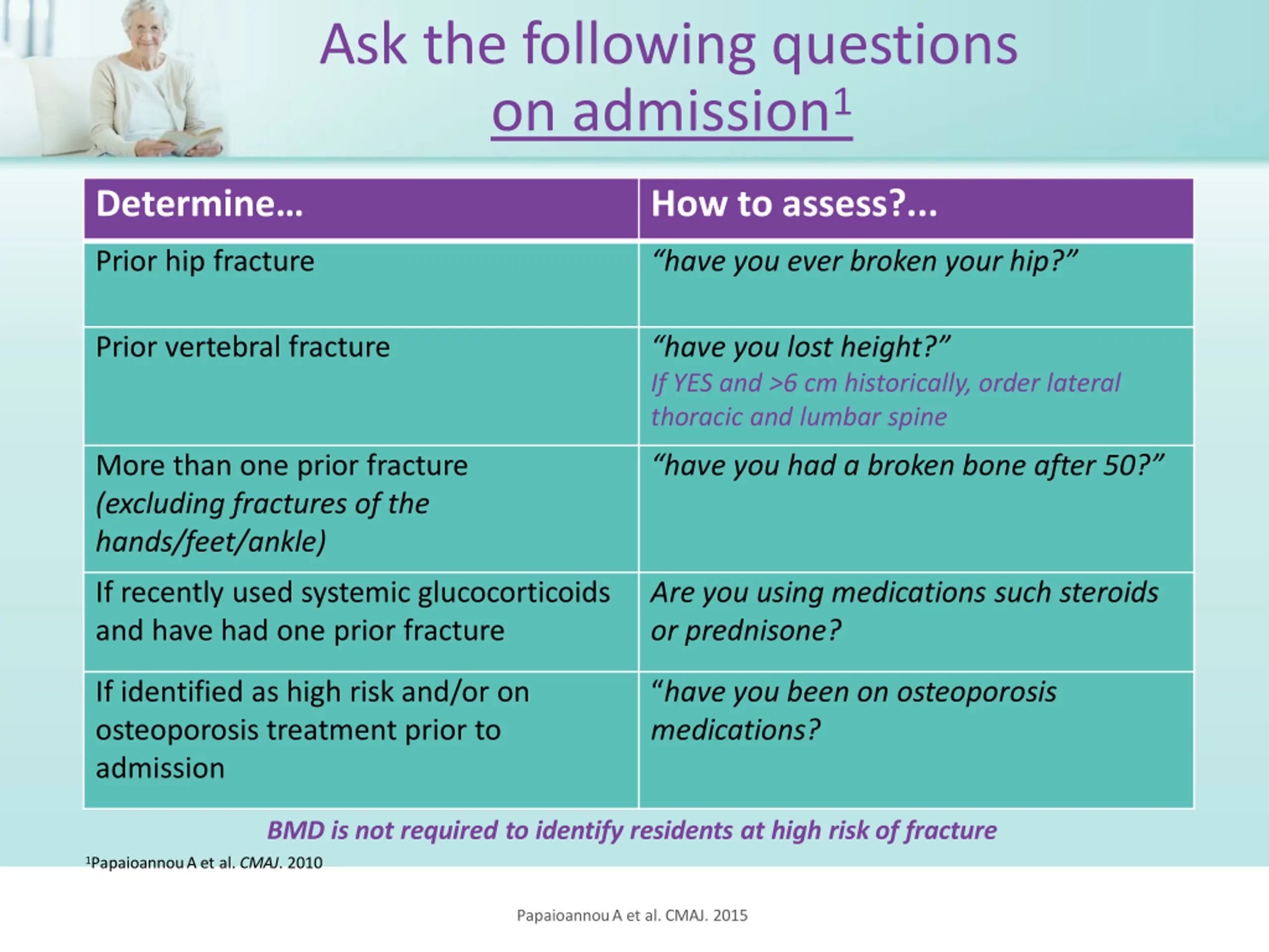 Ask the following questions on admission1 Determine How to assess?... Prior hip fracture have you ever broken your hip? Prior vertebral fracture have you lost height? If YES and >6 cm historically, order lateral thoracic and lumbar spine More than one prior fracture (excluding fractures of the hands/feet/ankle) have you had a broken bone after 50? If recently used systemic glucocorticoids and have had one prior fracture Are you using medications such steroids or prednisone? If identified as high risk and/or on osteoporosis treatment prior to admission have you been on osteoporosis medications? BMD is not required to identify residents at high risk of fracture 1PapaioannouAet al. CMAJ. 2010 PapaioannouA et al.CMAJ. 2015