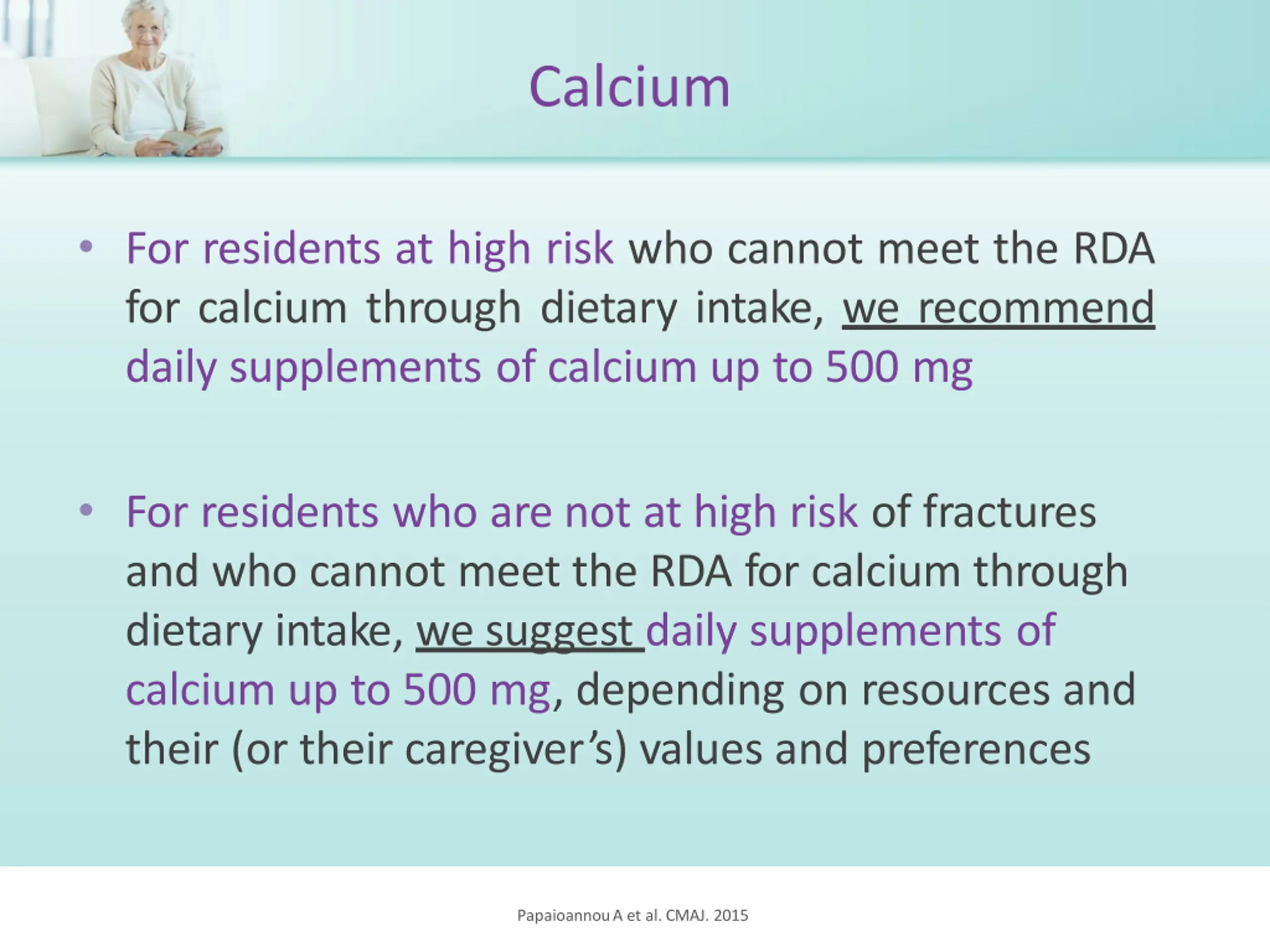 Calcium For residents at high risk who cannot meet the RDA for calcium through dietary intake, we recommend daily supplements of calcium up to 500 mg For residents who are not at high risk of fractures and who cannot meet the RDA for calcium through dietary intake, we suggest daily supplements of calcium up to 500 mg, depending on resources and their (or their caregiver s) values and preferences PapaioannouA et al.CMAJ. 2015