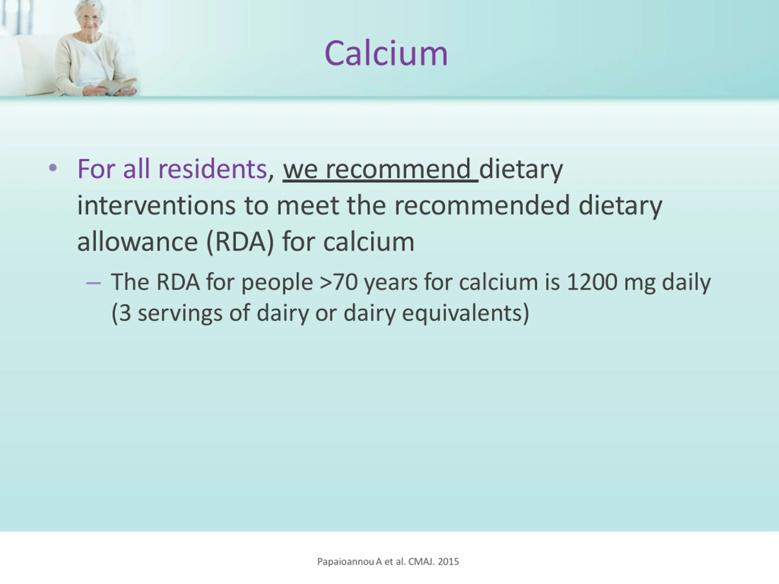 Calcium For all residents, we recommend dietary interventions to meet the recommended dietary allowance (RDA) for calcium The RDA for people >70 years for calcium is 1200 mg daily (3 servings of dairy or dairy equivalents) PapaioannouA et al.CMAJ. 2015