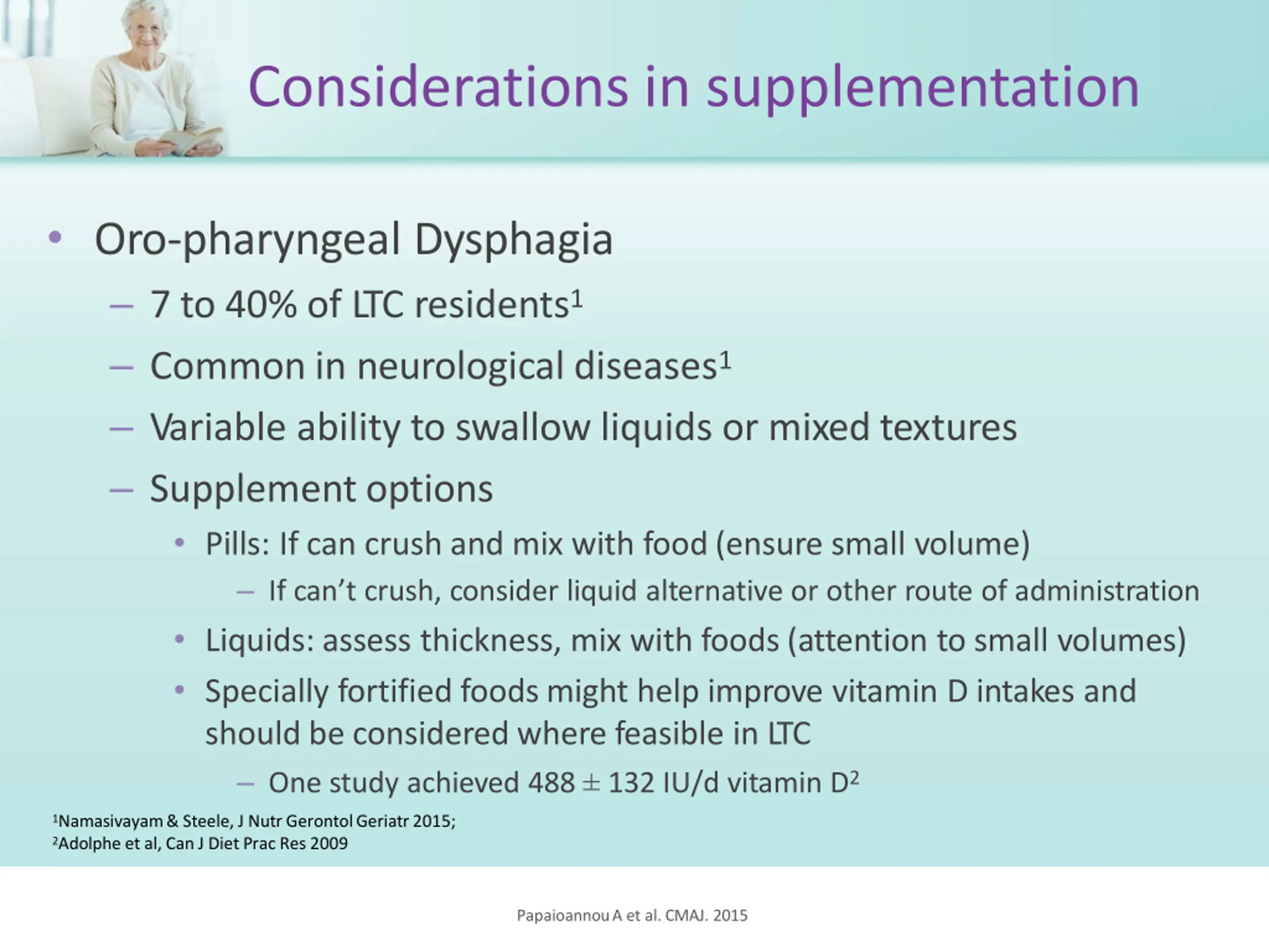 Considerations in supplementation Oro-pharyngeal Dysphagia 7 to 40% of LTC residents1 Commonin neurological diseases1 Variable ability to swallow liquids or mixedtextures Supplement options Pills: If can crush and mix with food(ensure small volume) If can t crush, consider liquid alternative or other route of administration Liquids: assess thickness, mix with foods(attention to small volumes) Specially fortified foodsmight help improve vitamin D intakes and should be considered where feasible in LTC One study achieved 488 132 IU/d vitamin D2 1Namasivayam& Steele, J NutrGerontolGeriatr2015; 2Adolphe et al, CanJ DietPrac Res 2009 PapaioannouA et al.CMAJ. 2015
