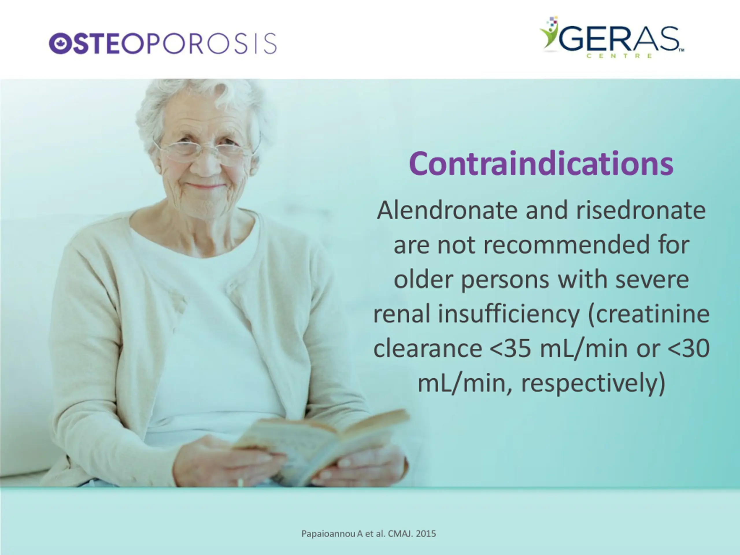 Contraindications Alendronate and risedronate are not recommended for older persons with severe renal insufficiency (creatinine clearance <35 mL/min or <30 mL/min, respectively) PapaioannouA et al.CMAJ. 2015