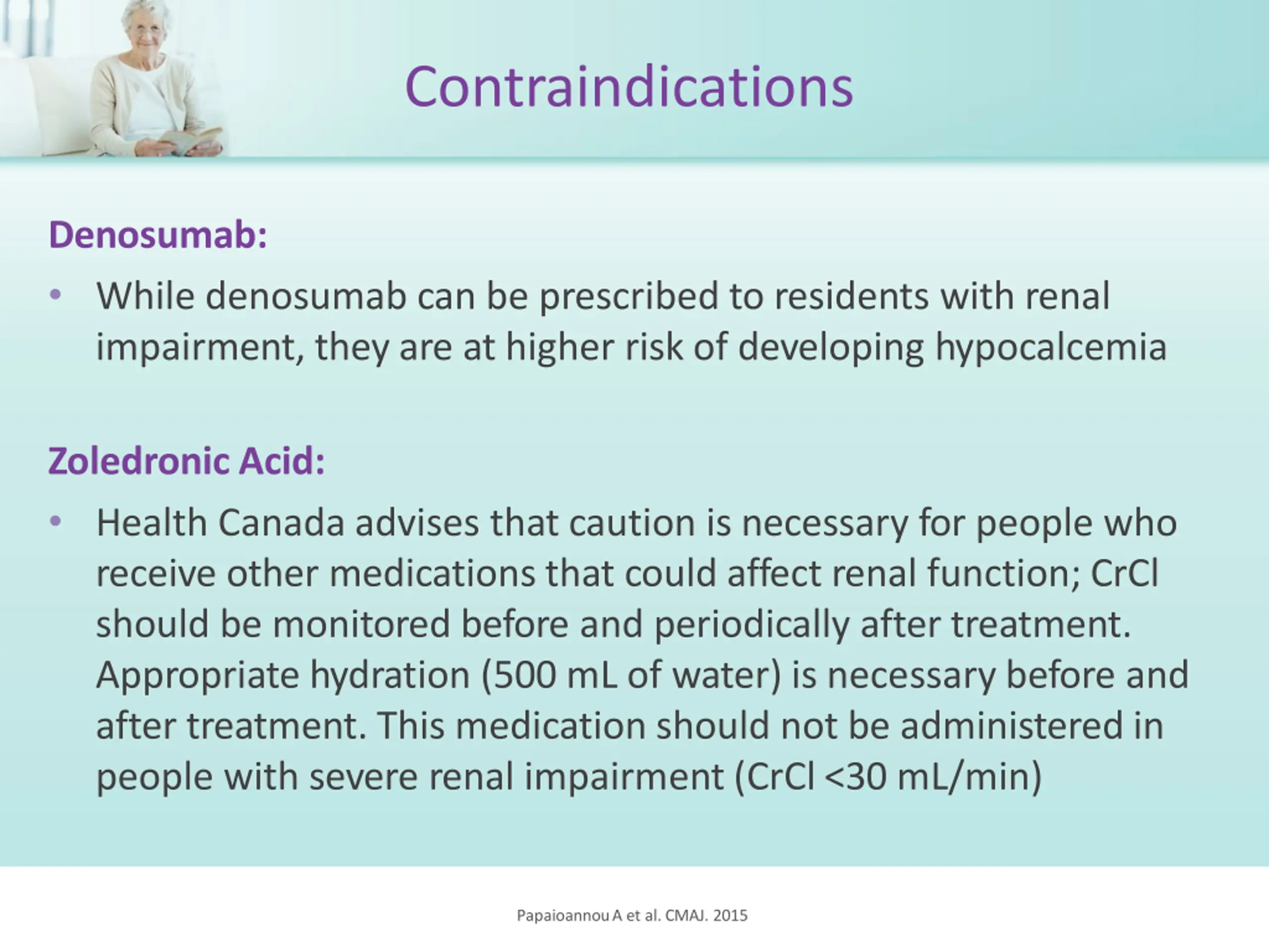 Contraindications Denosumab: While denosumab can be prescribed to residents with renal impairment, they are at higher risk of developing hypocalcemia ZoledronicAcid: Health Canada advises that caution is necessary for people who receive other medications that could affect renal function; CrCl should be monitored before and periodically after treatment. Appropriate hydration (500 mL of water) is necessary before and after treatment. This medication should not be administered in people with severe renal impairment (CrCl <30 mL/min) PapaioannouA et al.CMAJ. 2015