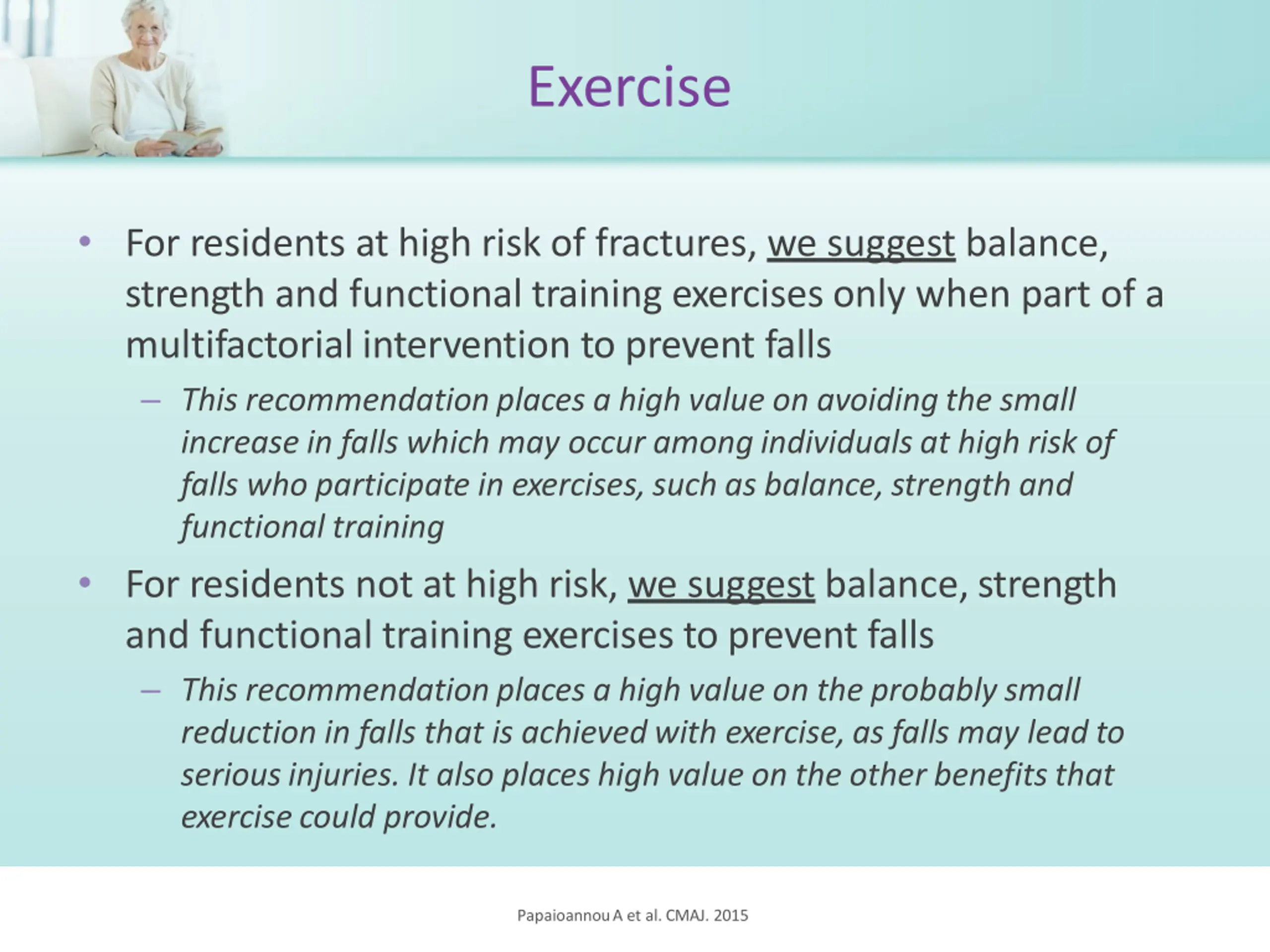 Exercise For residents at high risk of fractures, we suggest balance, strength and functional training exercises only when part of a multifactorial intervention to prevent falls This recommendationplaces a highvalue on avoidingthe small increase in falls which may occur amongindividualsat high risk of falls who participate in exercises,such as balance,strength and functional training For residents not at high risk, we suggest balance, strength and functional training exercises to prevent falls This recommendationplaces a highvalue on the probablysmall reduction in falls that is achievedwith exercise,as falls may lead to seriousinjuries.It also placeshigh valueon the otherbenefitsthat exercisecould provide. PapaioannouA et al.CMAJ. 2015