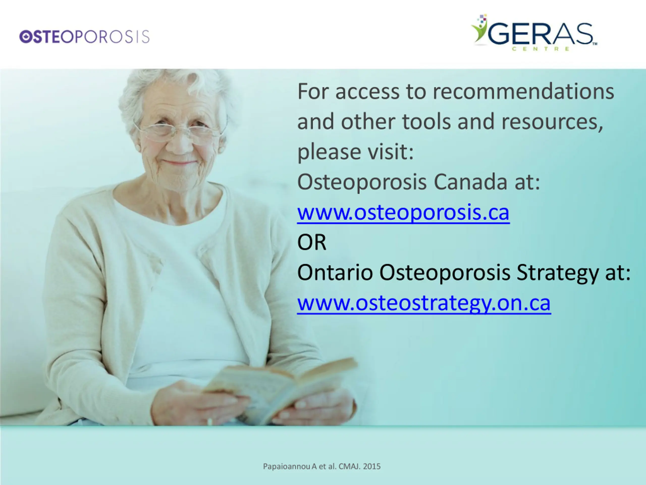 For access to recommendations and other tools and resources, please visit: Osteoporosis Canada at: www.osteoporosis.ca OR Ontario Osteoporosis Strategy at: www.osteostrategy.on.ca PapaioannouA et al.CMAJ. 2015