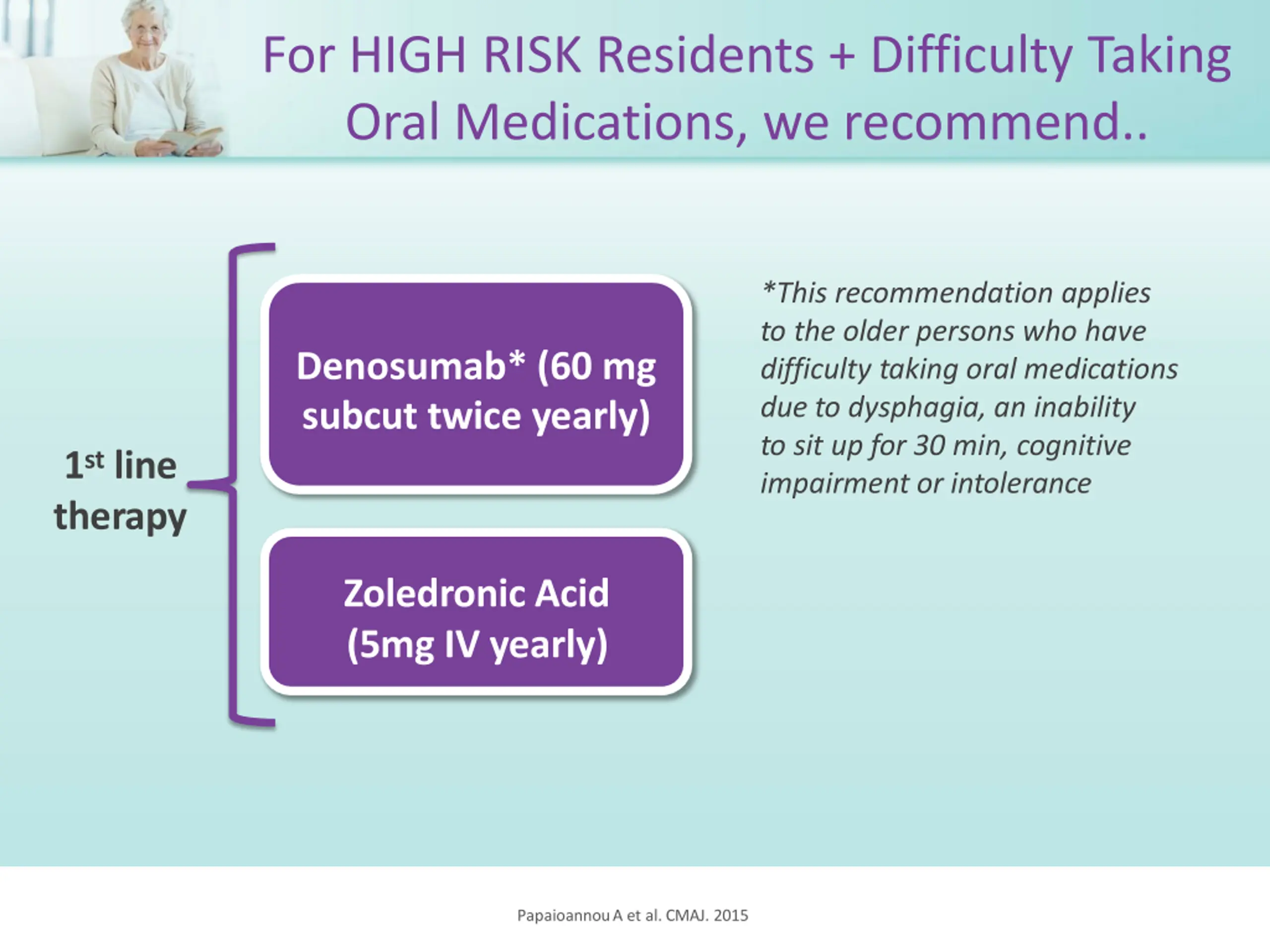 For HIGH RISK Residents + Difficulty Taking Oral Medications, we recommend.. *This recommendation applies to the older persons who have difficulty taking oral medications due to dysphagia, an inability to sit up for 30 min, cognitive impairment or intolerance Denosumab* (60 mg subcut twice yearly) 1stline therapy ZoledronicAcid (5mg IV yearly) PapaioannouA et al.CMAJ. 2015