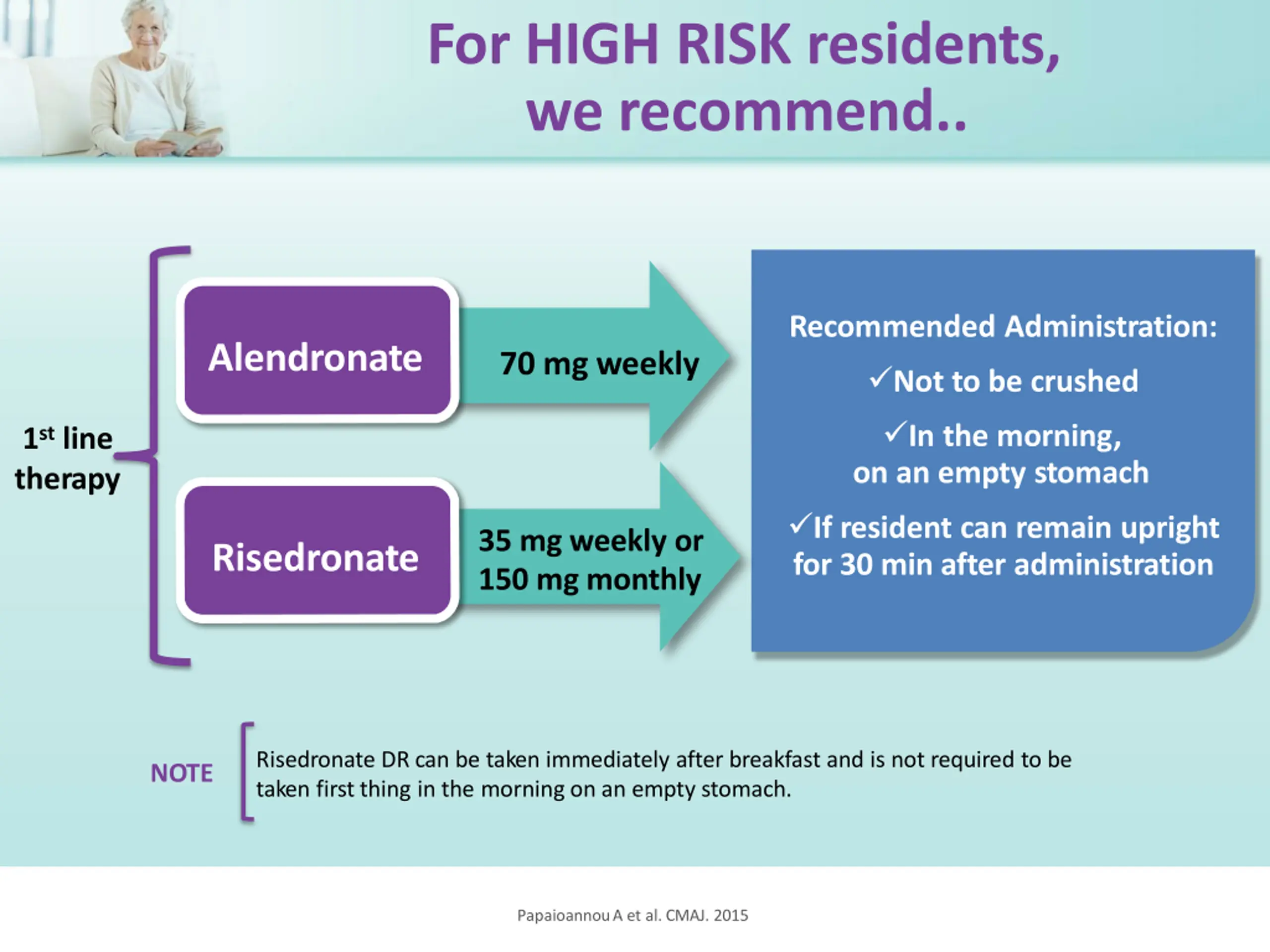 For HIGH RISK residents, we recommend.. Recommended Administration: Not to be crushed In the morning, on an empty stomach If resident can remain upright for 30 min after administration Alendronate 70 mg weekly 1stline therapy 35 mg weekly or 150 mg monthly Risedronate Risedronate DR can be taken immediately after breakfast and is not required to be taken firstthing in the morning on an empty stomach. NOTE PapaioannouA et al.CMAJ. 2015