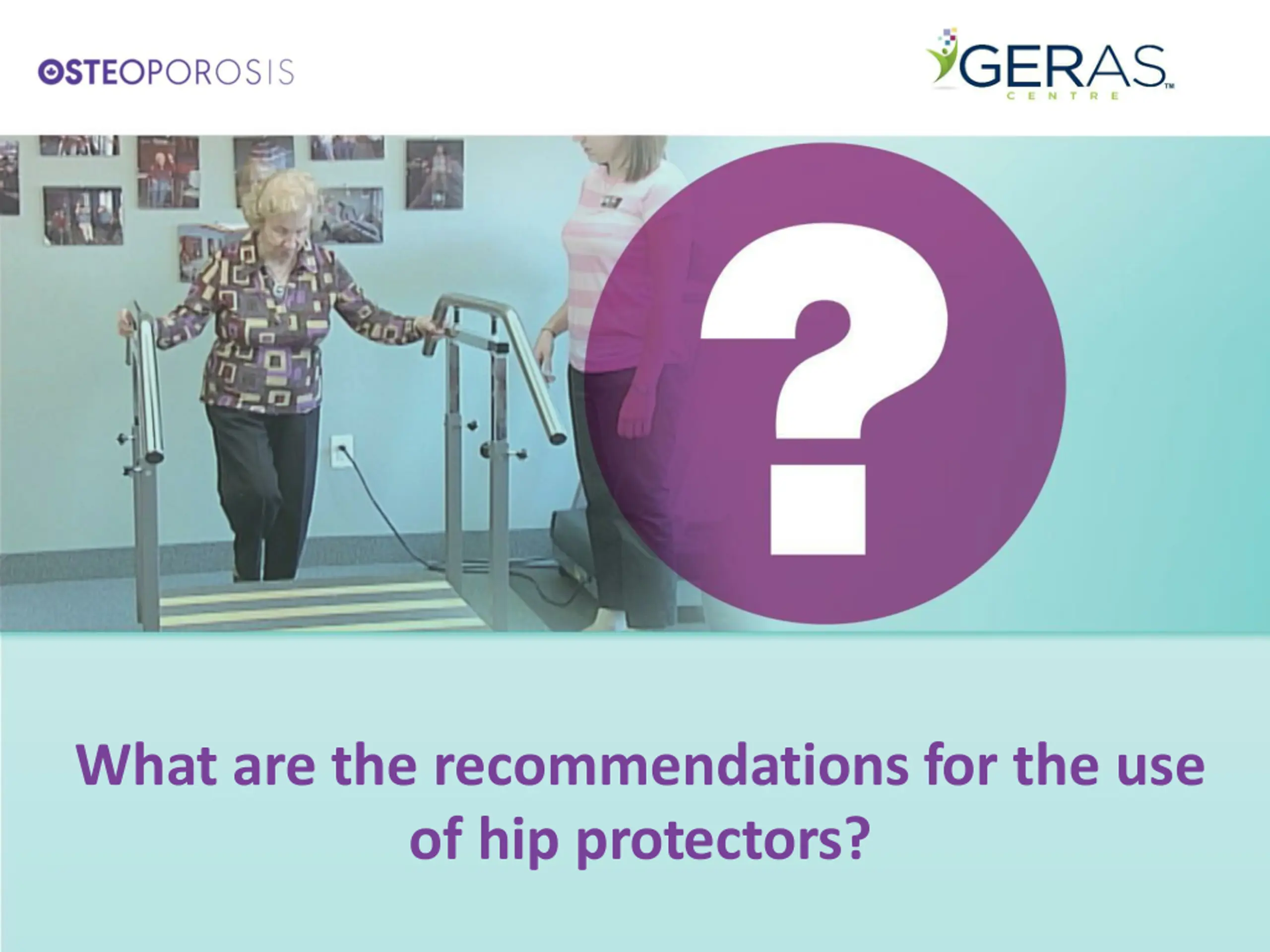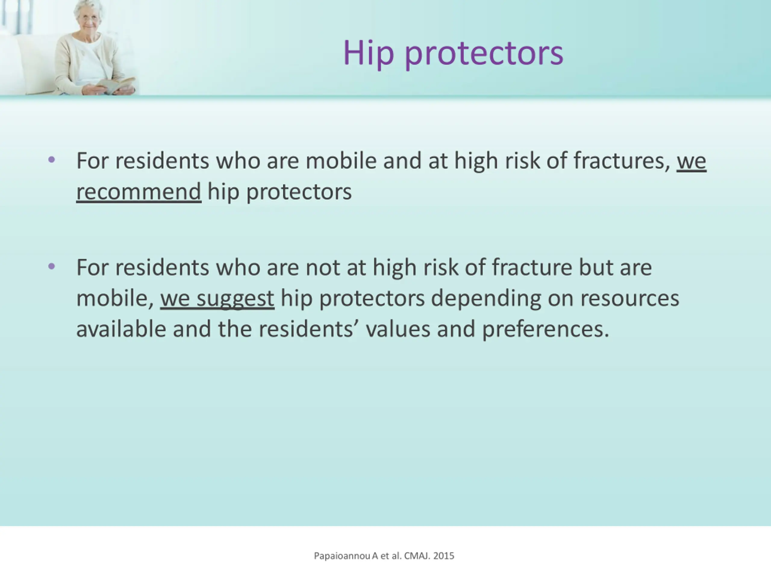 Hip protectors For residents who are mobile and at high risk of fractures, we recommend hip protectors For residents who are not at high risk of fracture but are mobile, we suggest hip protectors depending on resources available and the residents values and preferences. PapaioannouA et al.CMAJ. 2015