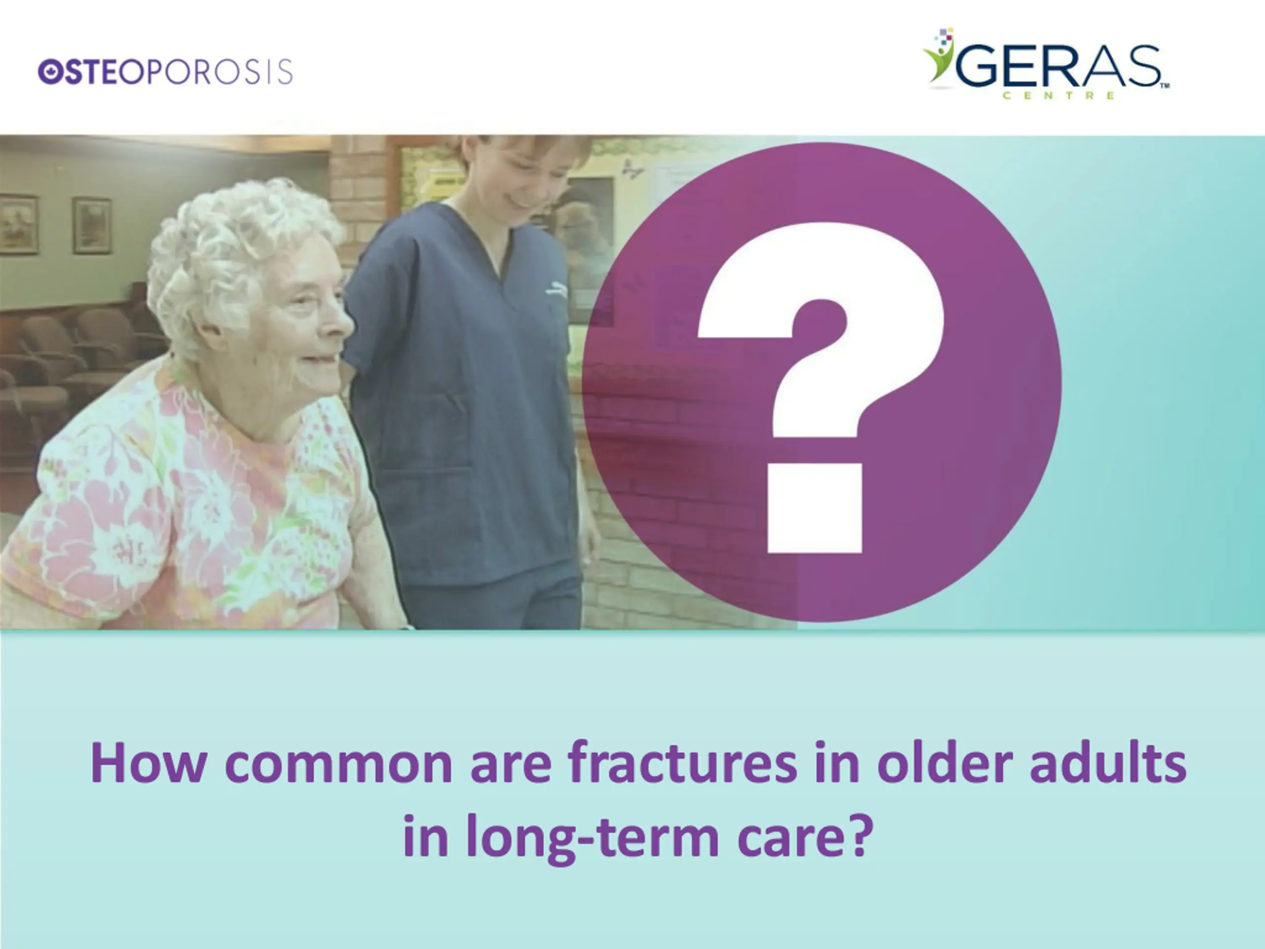Prevalence of fracture in LTC Prevalence of all fractures is higher in LTC Fracture rate for adults in LTC is 2-4 timesthat of similarly aged adults living in the community1 One third of older adults who experience hip fractures are residents in LTC2 Up to 30% of residents have vertebral fracture3 1Consensus Development Conference. Am J Med.1991 2Crilly RGet al. J Aging Research.2010 3RodondiA et al.OsteoporosInt. 2012 PapaioannouA et al.CMAJ. 2015