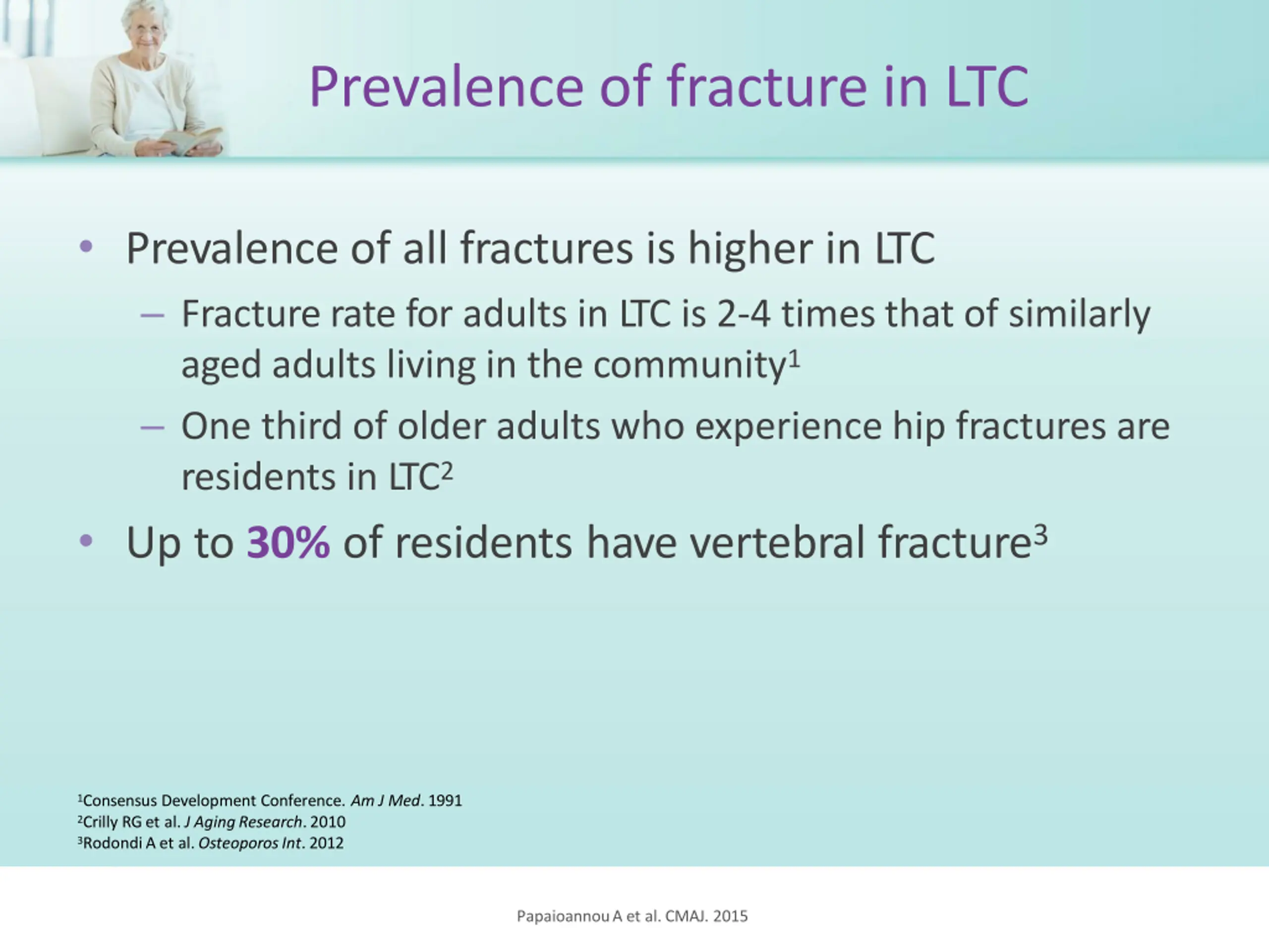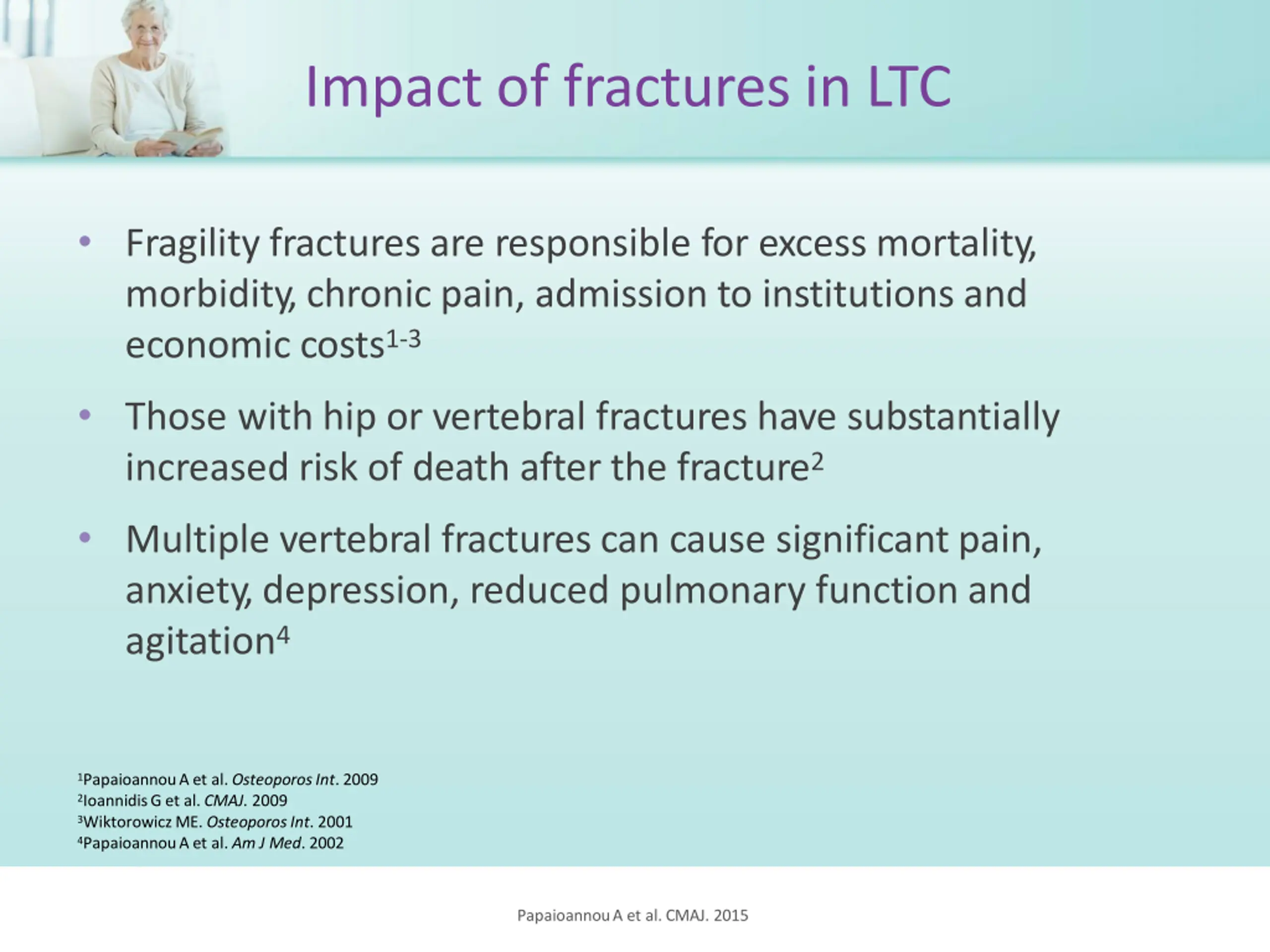 Impact of fractures in LTC Fragility fractures are responsible for excess mortality, morbidity, chronic pain, admission to institutions and economic costs1-3 Those with hip or vertebral fractures have substantially increased risk of death after the fracture2 Multiple vertebral fractures can cause significant pain, anxiety,depression, reduced pulmonary function and agitation4 1PapaioannouAet al. OsteoporosInt.2009 2IoannidisG et al. CMAJ. 2009 3Wiktorowicz ME. OsteoporosInt. 2001 4PapaioannouAet al. Am J Med. 2002 PapaioannouA et al.CMAJ. 2015