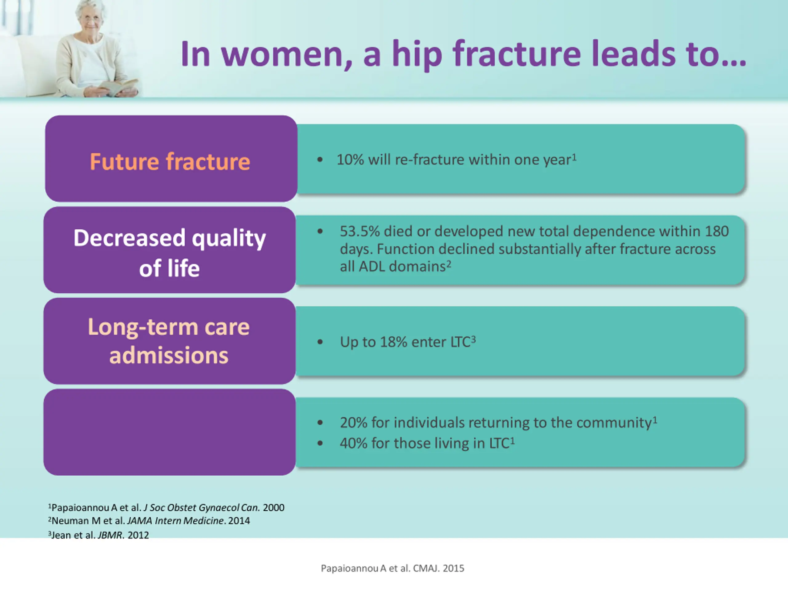 In women, a hip fracture leads to Future fracture 10% will re-fracture within one year1 53.5% died or developed new total dependence within 180 days.Function declined substantiallyafter fracture across all ADL domains2 Decreased quality of life Long-term care admissions Up to 18% enter LTC3 1-year 20% for individualsreturning to the community1 40% for thoseliving in LTC1 Mortality 1PapaioannouAet al. J SocObstet GynaecolCan. 2000 2Neuman M et al.JAMA Intern Medicine.2014 3Jean et al. JBMR. 2012 PapaioannouA et al.CMAJ. 2015