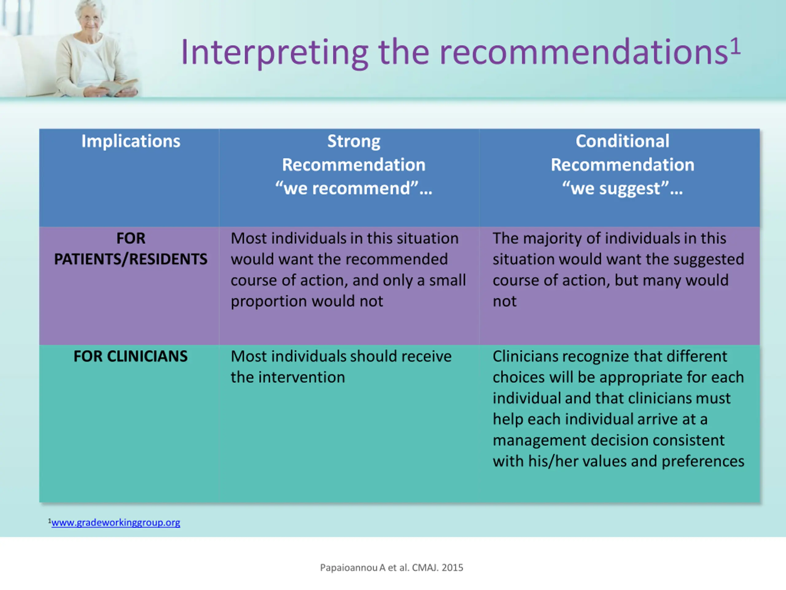 Interpreting the recommendations1 Implications Strong Conditional Recommendation we suggest Recommendation we recommend FOR Most individualsin this situation would want the recommended course of action, and only a small proportion would not The majority of individualsin this situationwould want the suggested course of action, but many would not PATIENTS/RESIDENTS FOR CLINICIANS Most individualsshould receive the intervention Cliniciansrecognize that different choices will be appropriate for each individualand that cliniciansmust help each individualarrive at a management decision consistent with his/her values and preferences 1www.gradeworkinggroup.org PapaioannouA et al.CMAJ. 2015