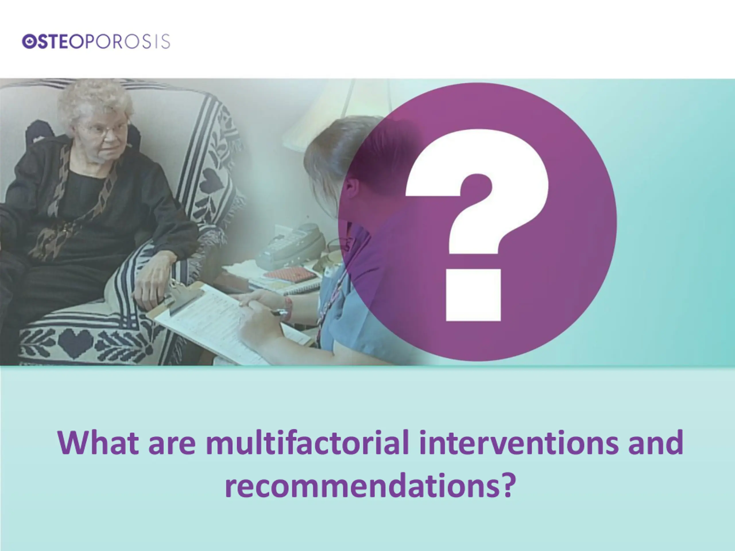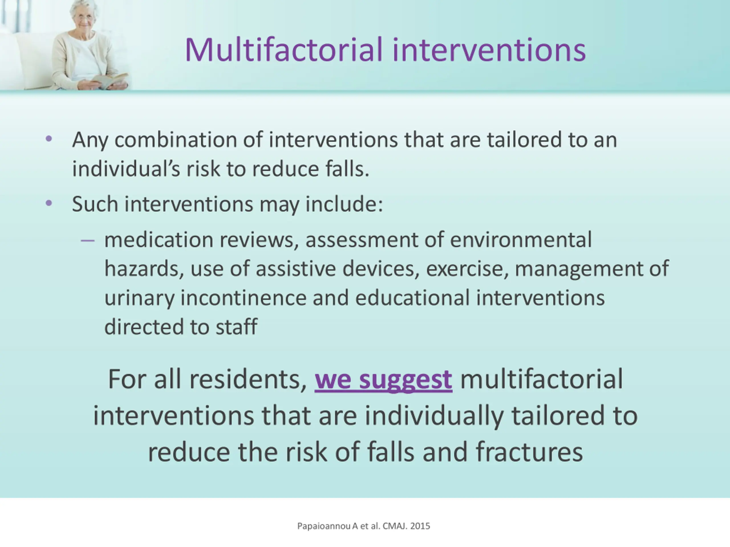 Multifactorial interventions Any combination of interventions that are tailored to an individual s risk to reduce falls. Such interventions may include: medication reviews, assessment of environmental hazards, use of assistive devices, exercise,managementof urinary incontinence and educational interventions directed to staff For all residents, we suggest multifactorial interventions that are individually tailored to reduce the risk of falls and fractures PapaioannouA et al.CMAJ. 2015