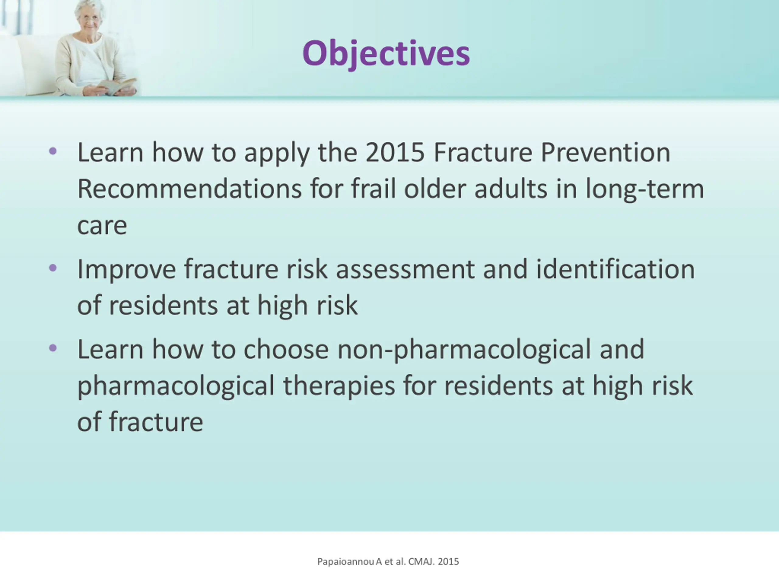 Objectives Learn how to apply the 2015 Fracture Prevention Recommendations for frail older adults in long-term care Improve fracture risk assessment and identification of residents at high risk Learn how to choose non-pharmacological and pharmacological therapies for residents at high risk of fracture PapaioannouA et al.CMAJ. 2015
