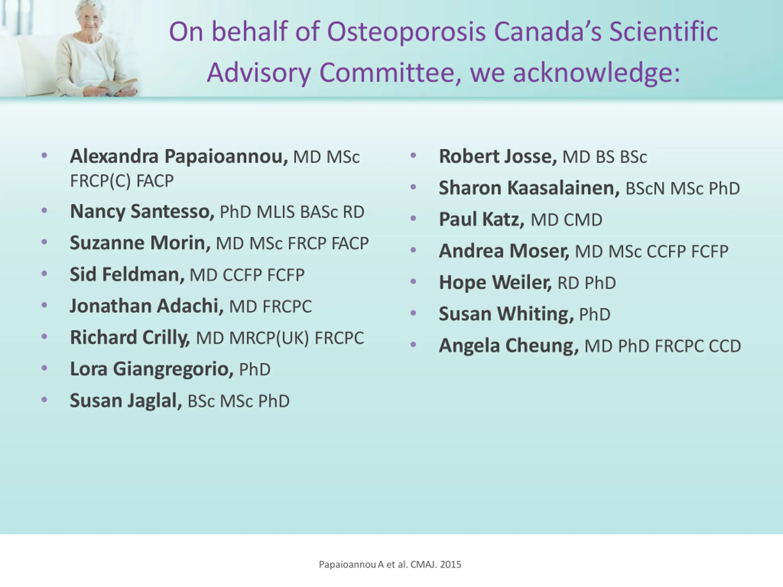 On behalf of Osteoporosis Canadas Scientific Advisory Committee, we acknowledge: Alexandra Papaioannou, MD MSc FRCP(C) FACP Nancy Santesso, PhD MLIS BASc RD Suzanne Morin, MD MSc FRCP FACP Sid Feldman, MD CCFP FCFP Jonathan Adachi, MD FRCPC Richard Crilly, MD MRCP(UK) FRCPC Lora Giangregorio, PhD Susan Jaglal, BSc MSc PhD Robert Josse, MD BS BSc Sharon Kaasalainen, BScN MSc PhD Paul Katz, MD CMD Andrea Moser, MD MSc CCFP FCFP Hope Weiler, RD PhD Susan Whiting, PhD Angela Cheung, MD PhD FRCPC CCD PapaioannouA et al.CMAJ. 2015
