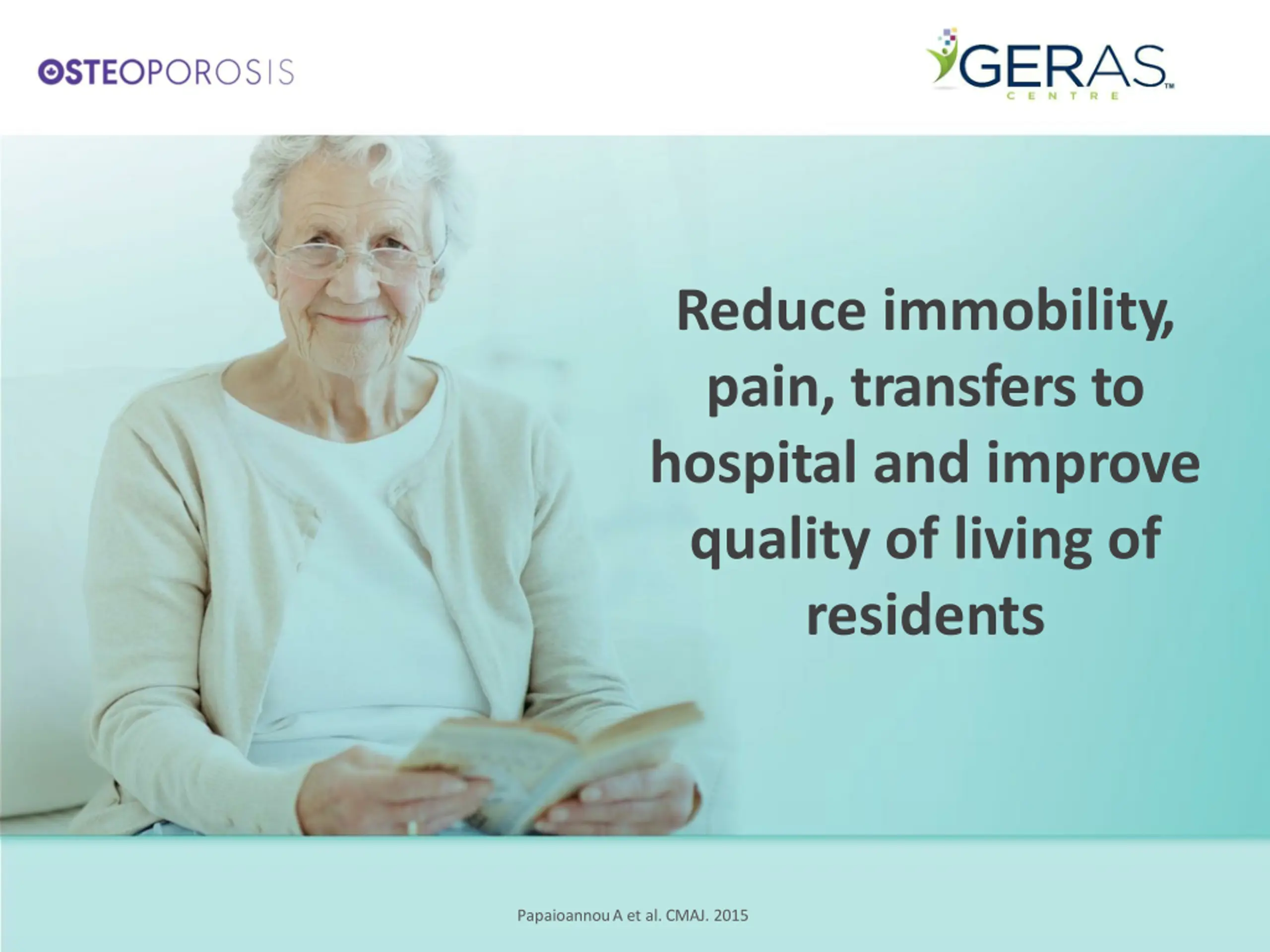 Reduce immobility, pain, transfers to hospital and improve quality of living of residents PapaioannouA et al.CMAJ. 2015