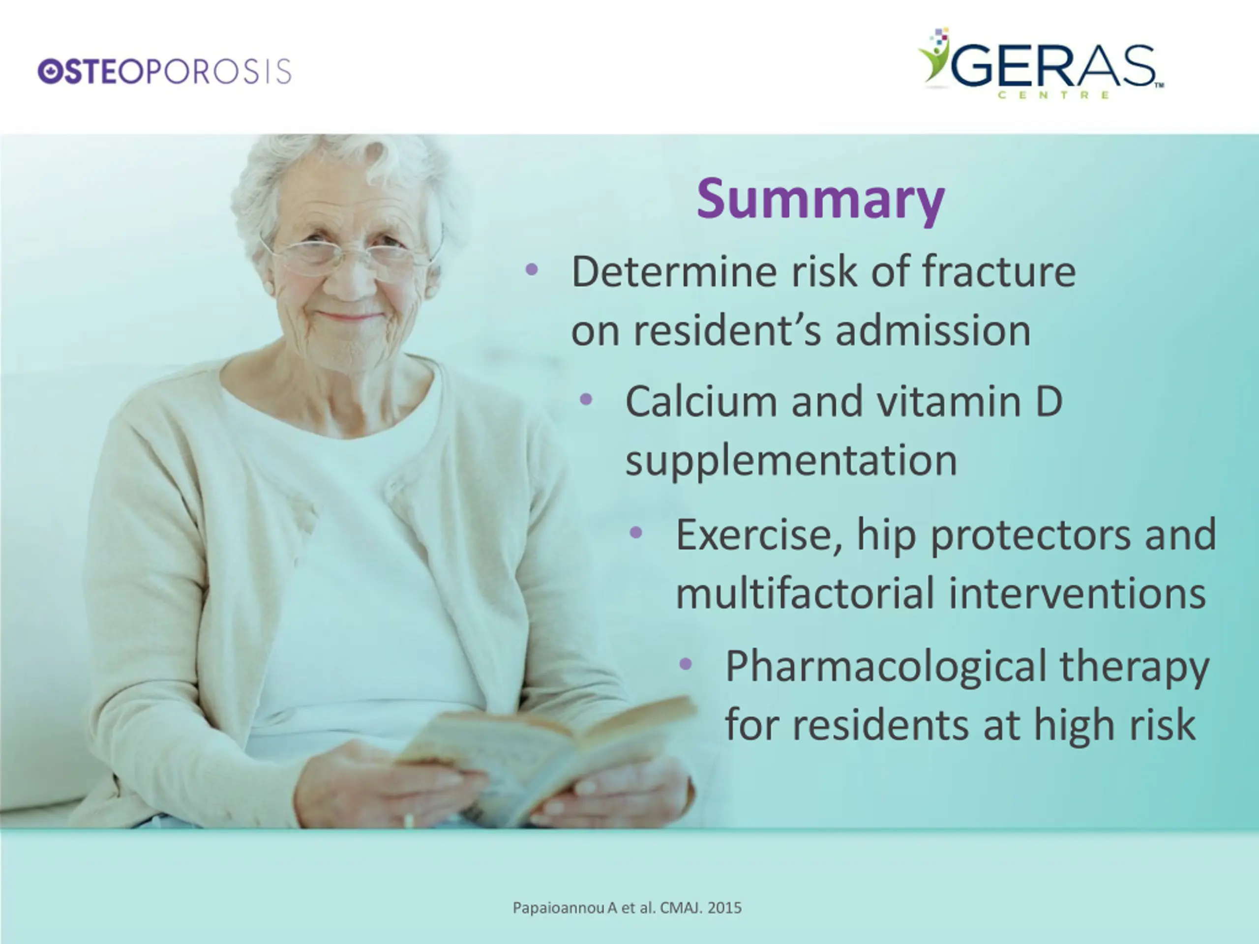 Summary Determine risk of fracture on resident s admission Calcium and vitamin D supplementation Exercise, hip protectors and multifactorial interventions Pharmacological therapy for residents at high risk PapaioannouA et al.CMAJ. 2015