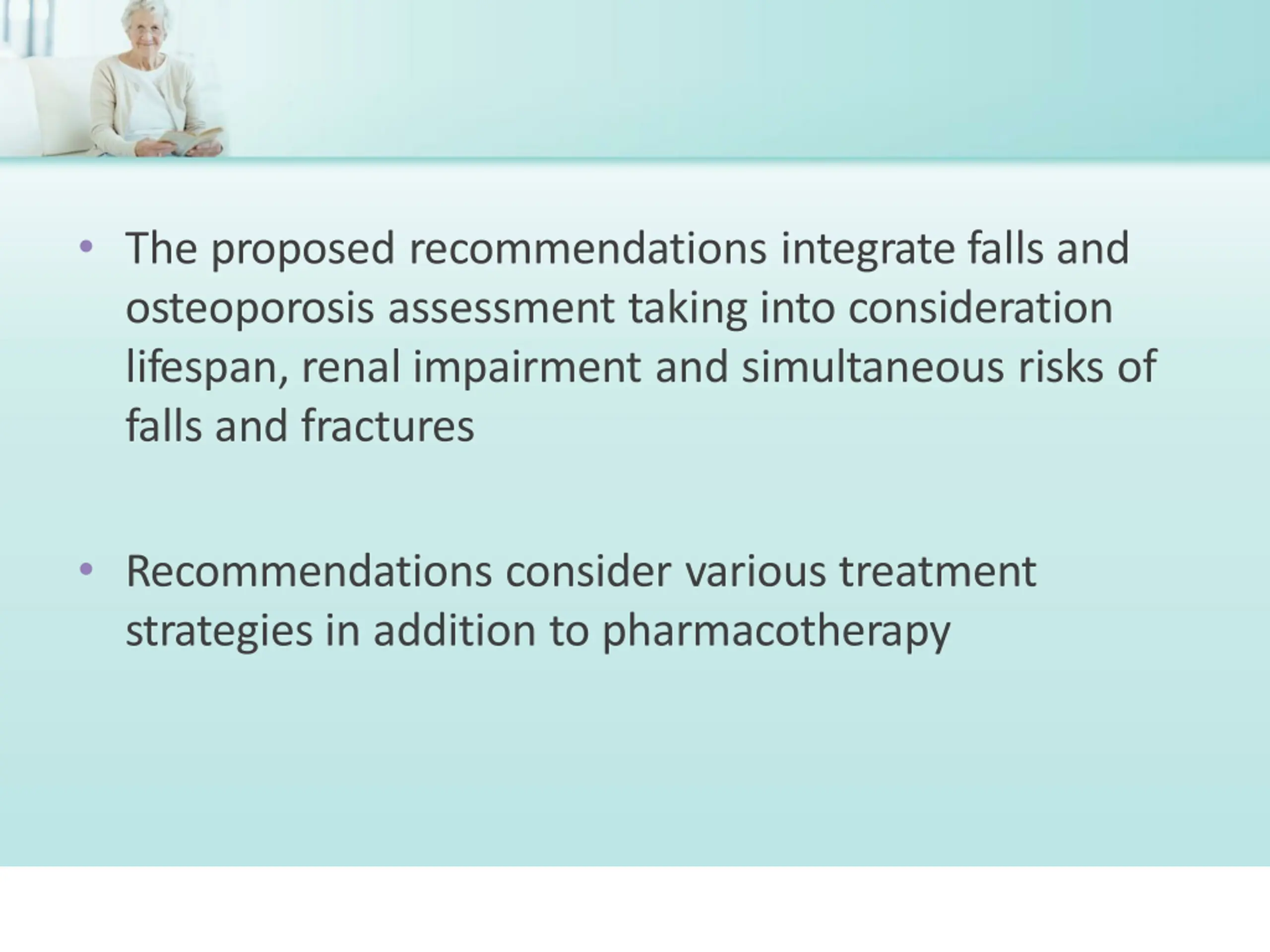 The proposed recommendations integrate falls and osteoporosis assessment taking into consideration lifespan, renal impairment and simultaneous risks of falls and fractures Recommendations consider various treatment strategies in addition to pharmacotherapy