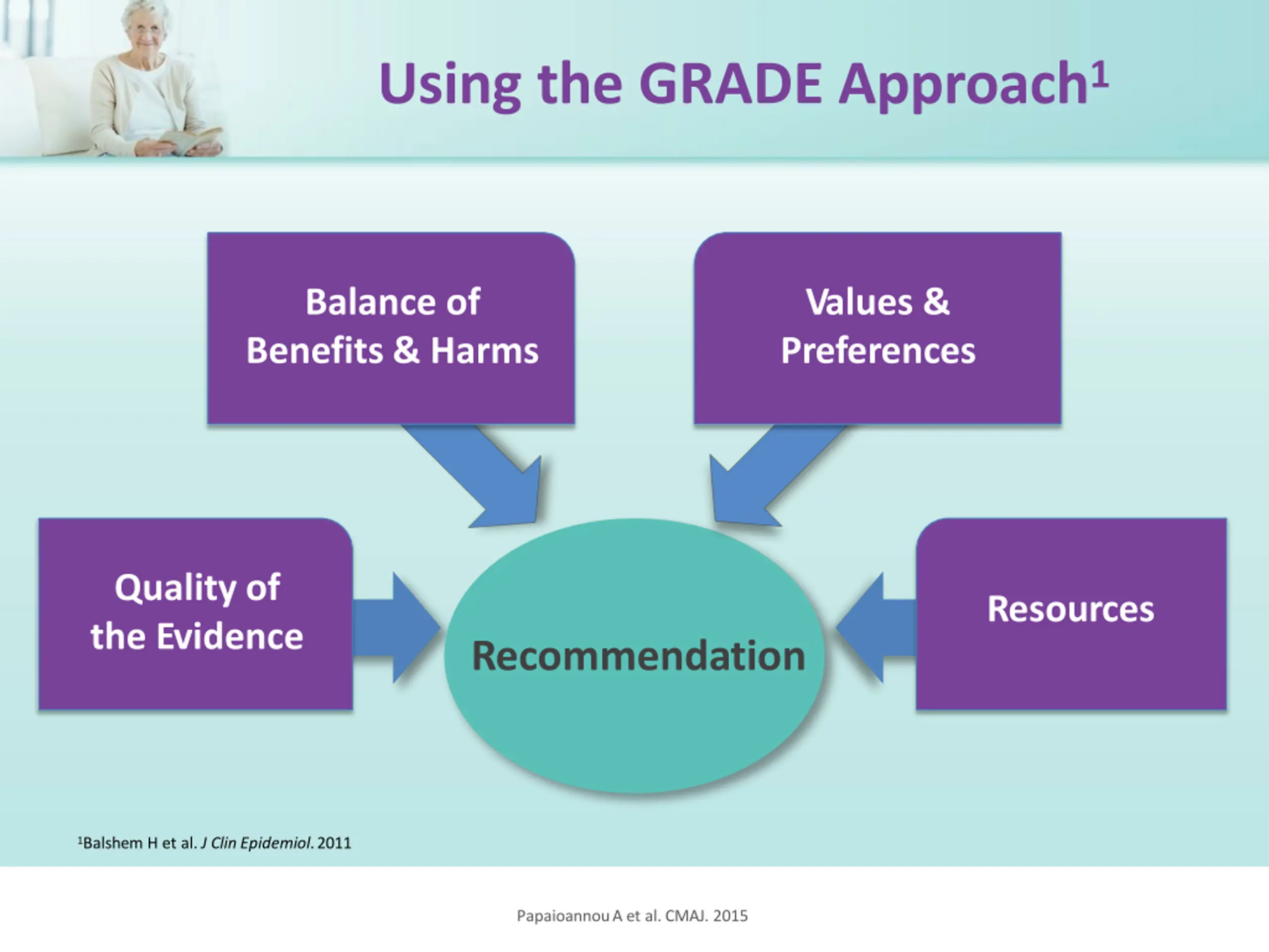 Using the GRADE Approach1 Balance of Benefits & Harms Values & Preferences Quality of the Evidence Resources Recommendation 1Balshem H et al. J ClinEpidemiol.2011 PapaioannouA et al.CMAJ. 2015
