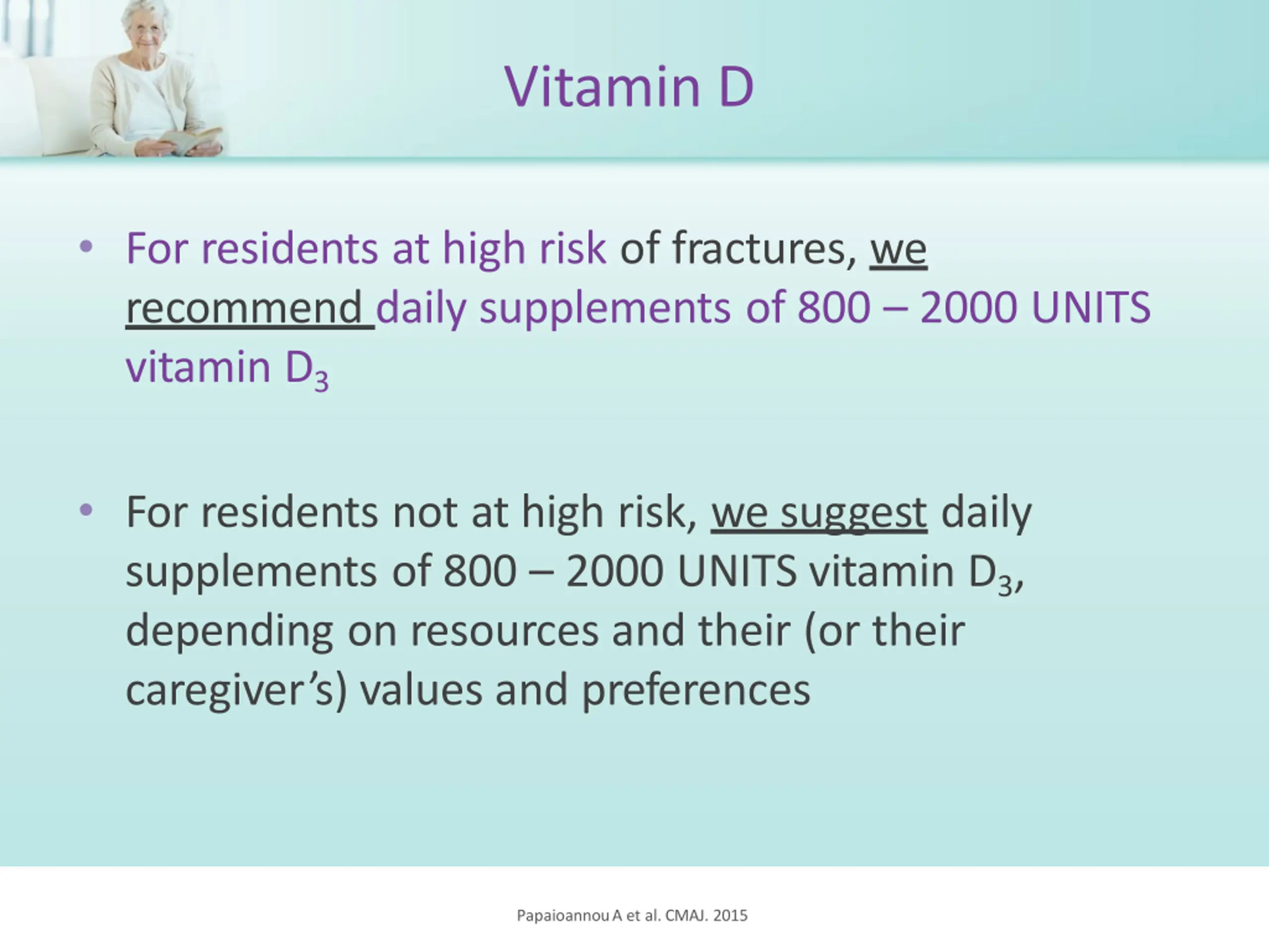 Vitamin D For residents at high risk of fractures, we recommend daily supplements of 800 2000 UNITS vitamin D3 For residents not at high risk, we suggest daily supplements of 800 2000 UNITS vitamin D3, depending on resources and their (or their caregiver s) values and preferences PapaioannouA et al.CMAJ. 2015