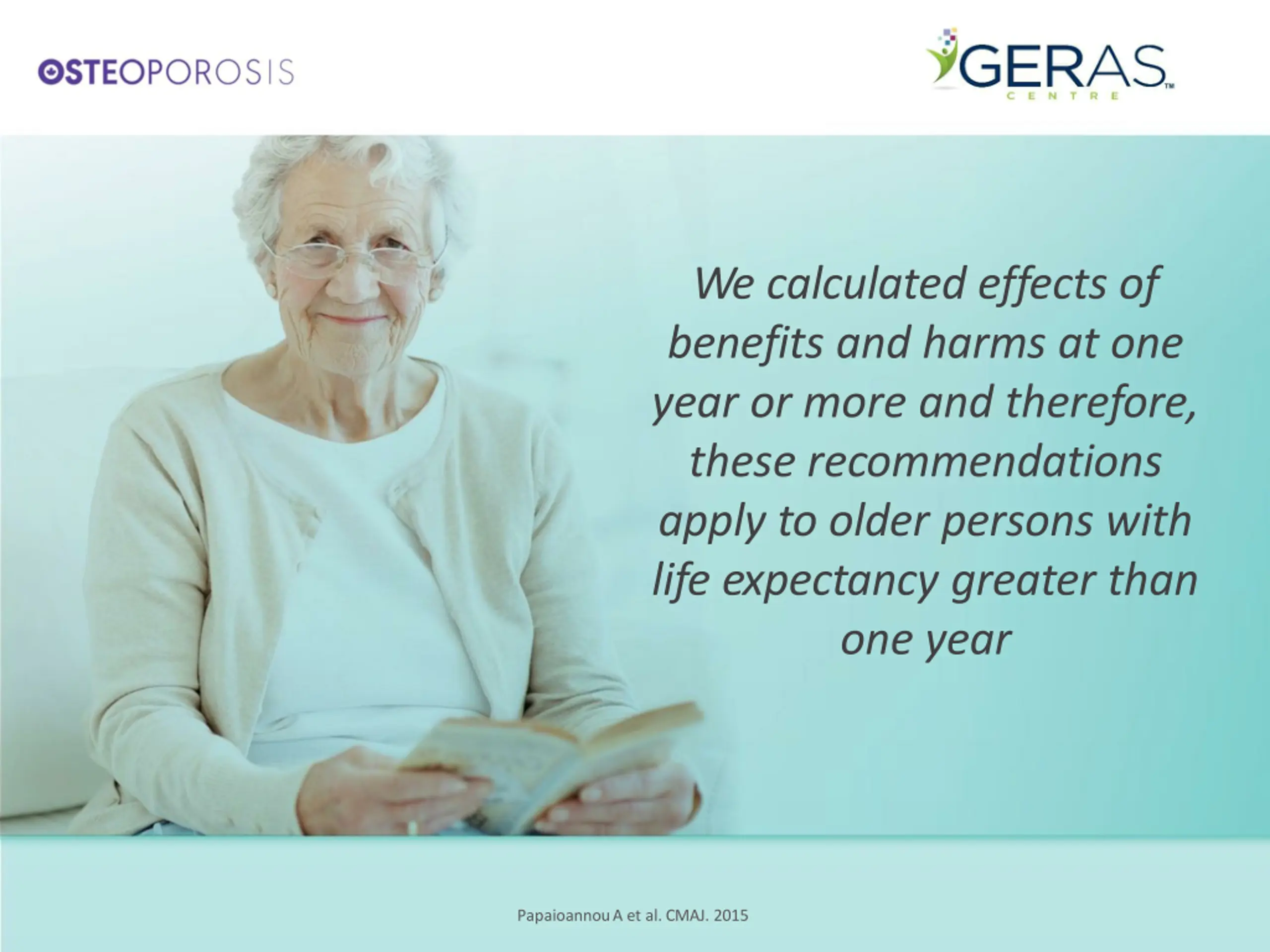We calculated effects of benefits and harms at one year or more and therefore, these recommendations apply to older persons with life expectancy greater than one year PapaioannouA et al.CMAJ. 2015