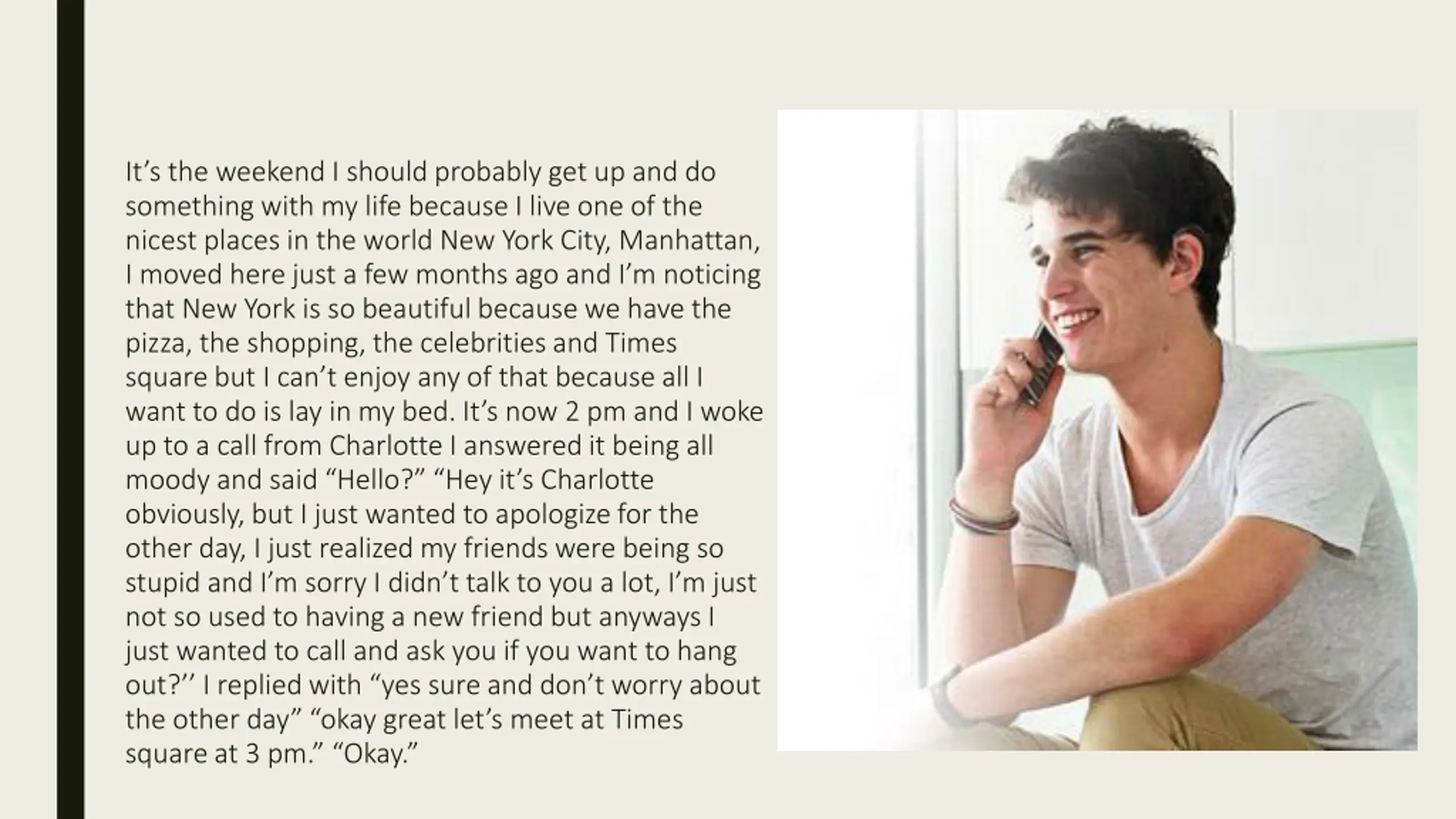 Its the weekend I should probably get up and do something with my life because I live one of the nicest places in the world New York City, Manhattan, I moved here just a few months ago and I m noticing that New York is so beautiful because we have the pizza, the shopping, the celebrities and Times square but I can t enjoy any of that because all I want to do is lay in my bed. It s now 2 pm and I woke up to a call from Charlotte I answered it being all moody and said Hello? Hey it s Charlotte obviously, but I just wanted to apologize for the other day, I just realized my friends were being so stupid and I m sorry I didn t talk to you a lot, I m just not so used to having a new friend but anyways I just wanted to call and ask you if you want to hang out? I replied with yes sure and don t worry about the other day okay great let s meet at Times square at 3 pm. Okay.