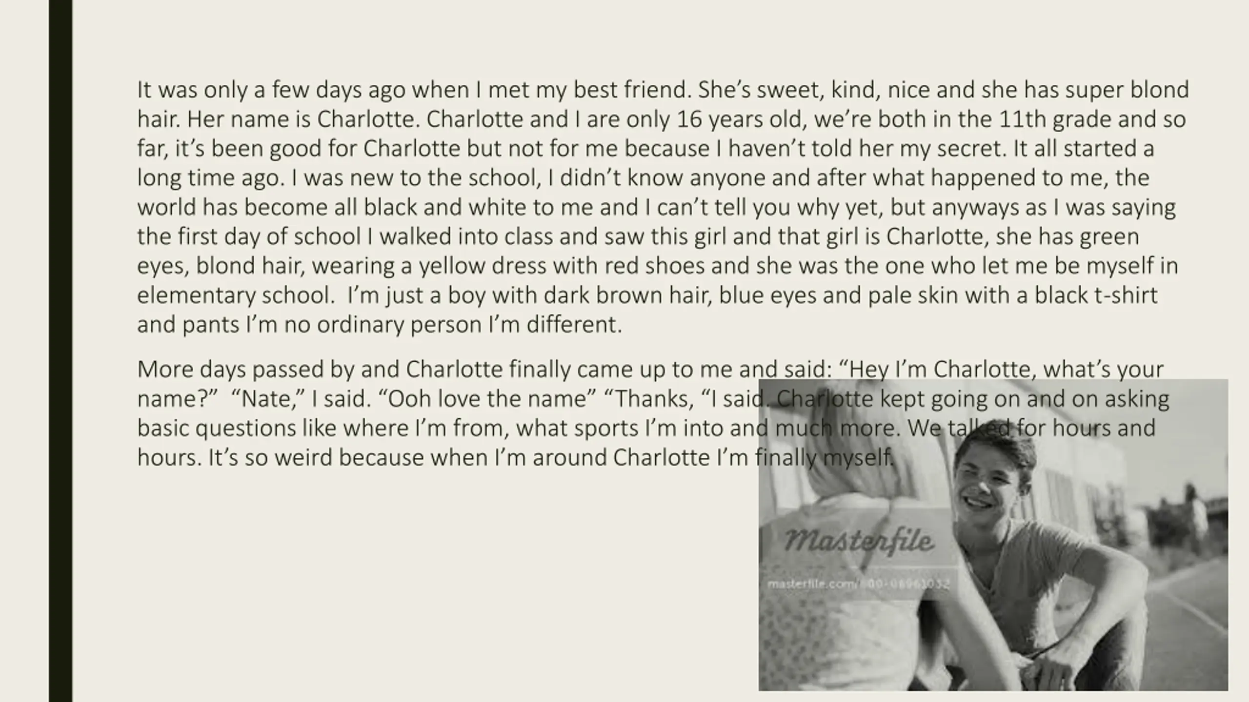 It was only a few days ago when I met my best friend. Shes sweet, kind, nice and she has super blond hair. Her name is Charlotte. Charlotte and I are only 16 years old, we re both in the 11th grade and so far, it s been good for Charlotte but not for me because I haven t told her my secret. It all started a long time ago. I was new to the school, I didn t know anyone and after what happened to me, the world has become all black and white to me and I can t tell you why yet, but anyways as I was saying the first day of school I walked into class and saw this girl and that girl is Charlotte, she has green eyes, blond hair, wearing a yellow dress with red shoes and she was the one who let me be myself in elementary school. I m just a boy with dark brown hair, blue eyes and pale skin with a black t-shirt and pants I m no ordinary person I m different. More days passed by and Charlotte finally came up to me and said: Hey I m Charlotte, what s your name? Nate, I said. Ooh love the name Thanks, I said. Charlotte kept going on and on asking basic questions like where I m from, what sports I m into and much more. We talked for hours and hours. It s so weird because when I m around Charlotte I m finally myself.