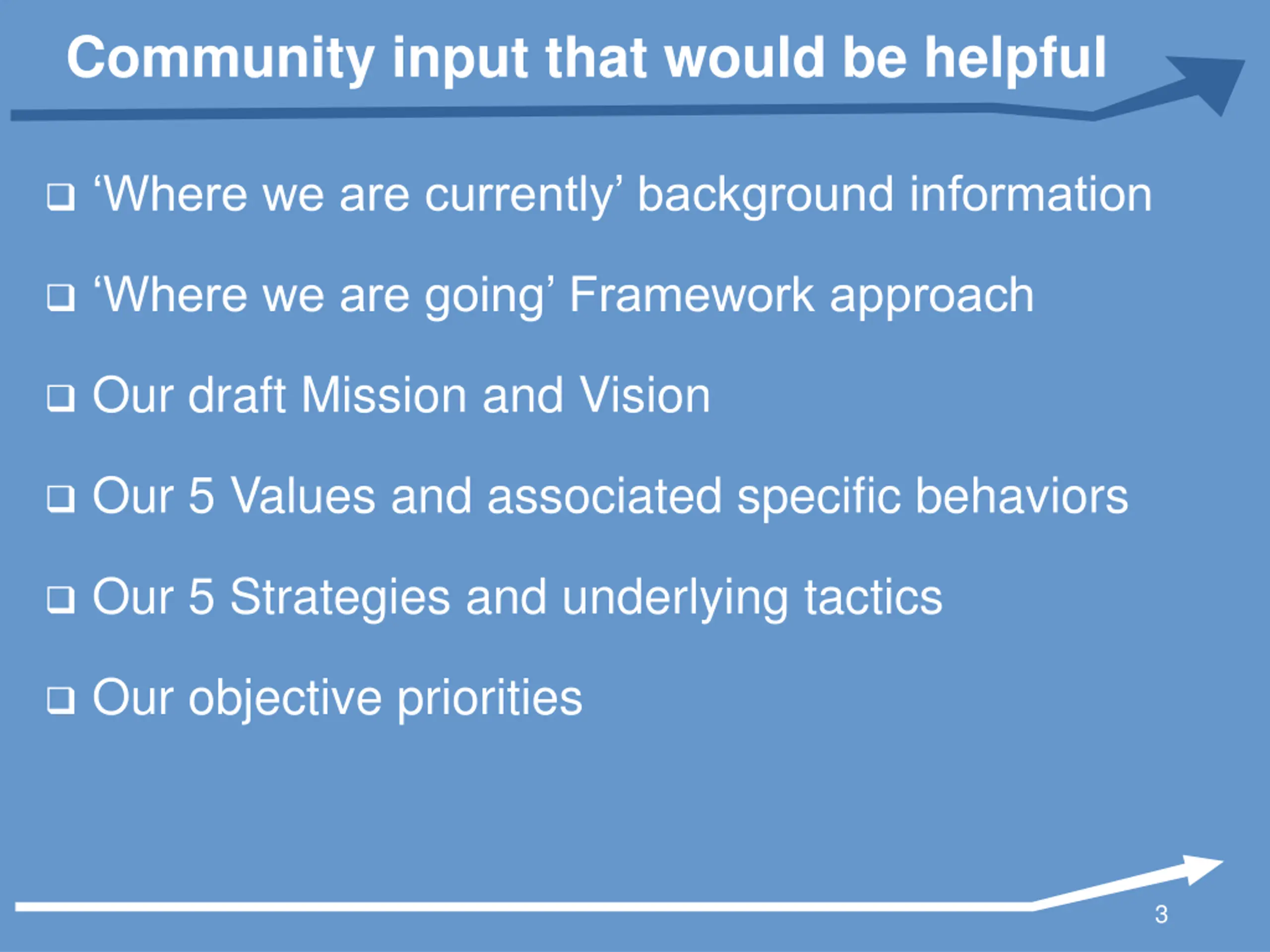 Community input that would be helpful Where we are currently background information Where we are going Framework approach Our draft Mission and Vision Our 5 Values and associated specific behaviors Our 5 Strategies and underlying tactics Our objective priorities 3